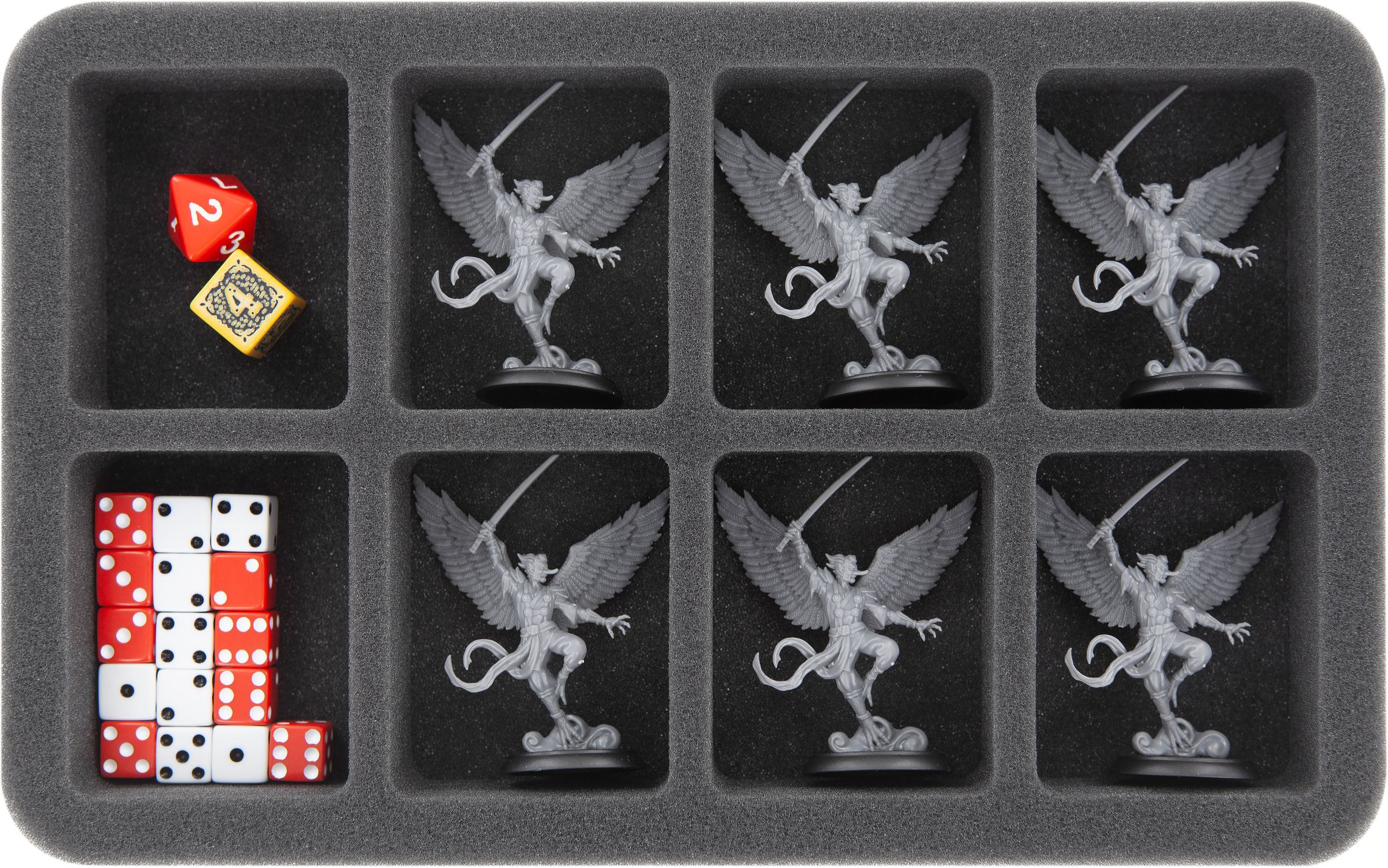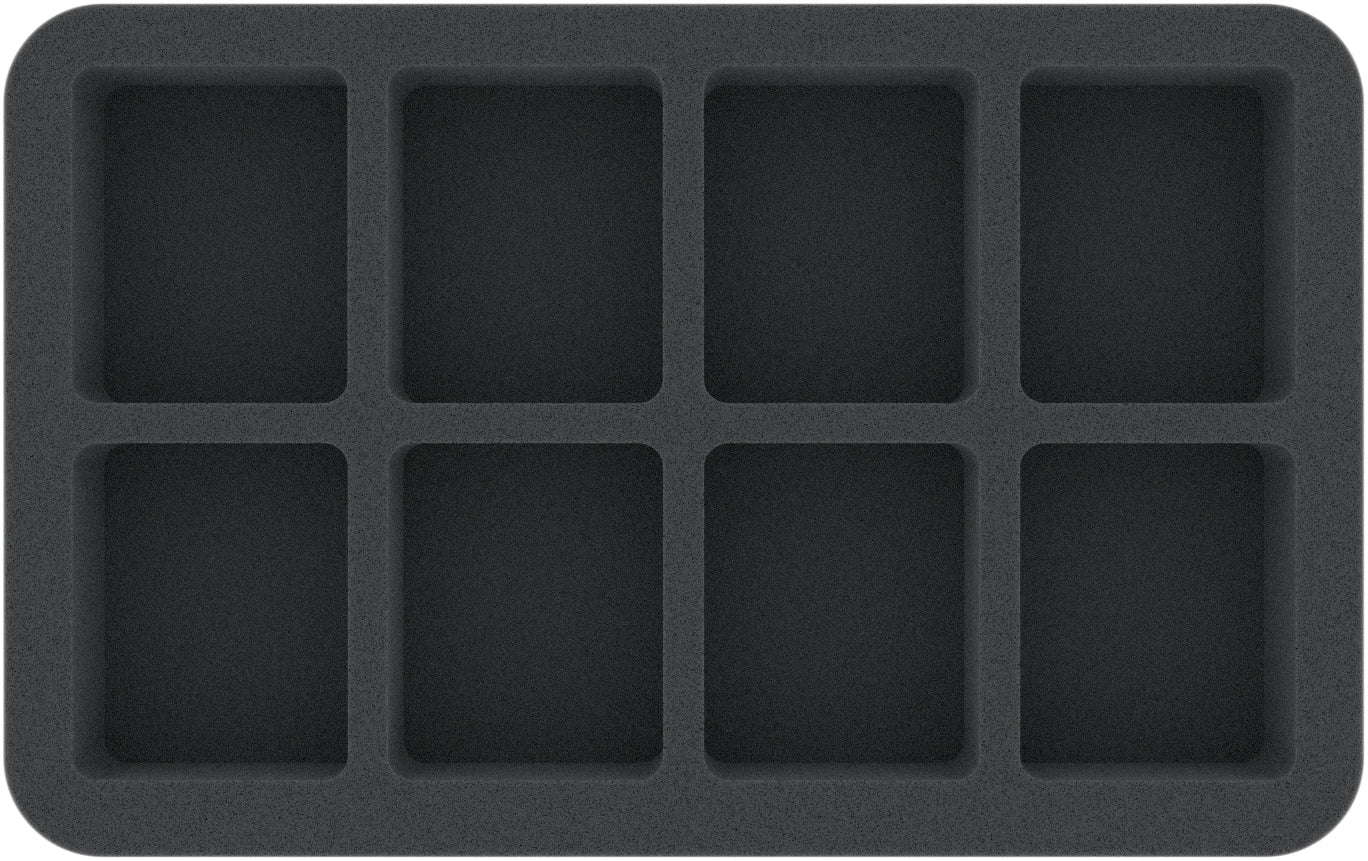 This foam tray features 8 same-sized compartments for the safe and orderly storage of small or medium-sized "Shadows of Brimstone" miniatures on up to 30 mm bases. The fine-pored foam provides reliable protection against damage – delicate parts stay intact, the color of painted models remains unharmed.