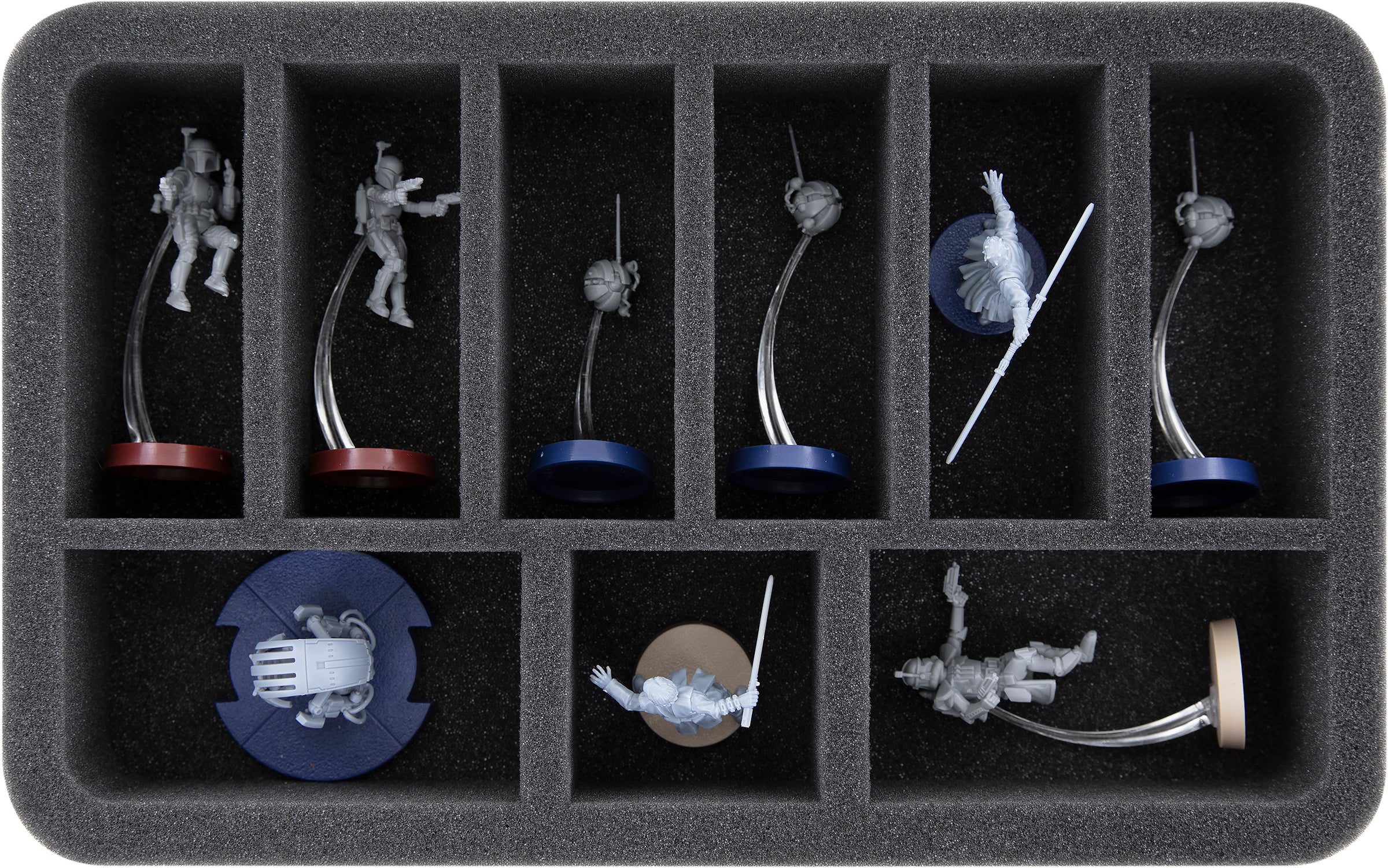 On this Feldherr foam tray you have space for 9 miniatures. The insert is particularly suitable for storing units on flying bases, such as the Clan Wren. Also Darth Maul with the Sith Probe Droids, Anakin Skywalker, and miniatures with similar dimensions are perfectly accommodated here.