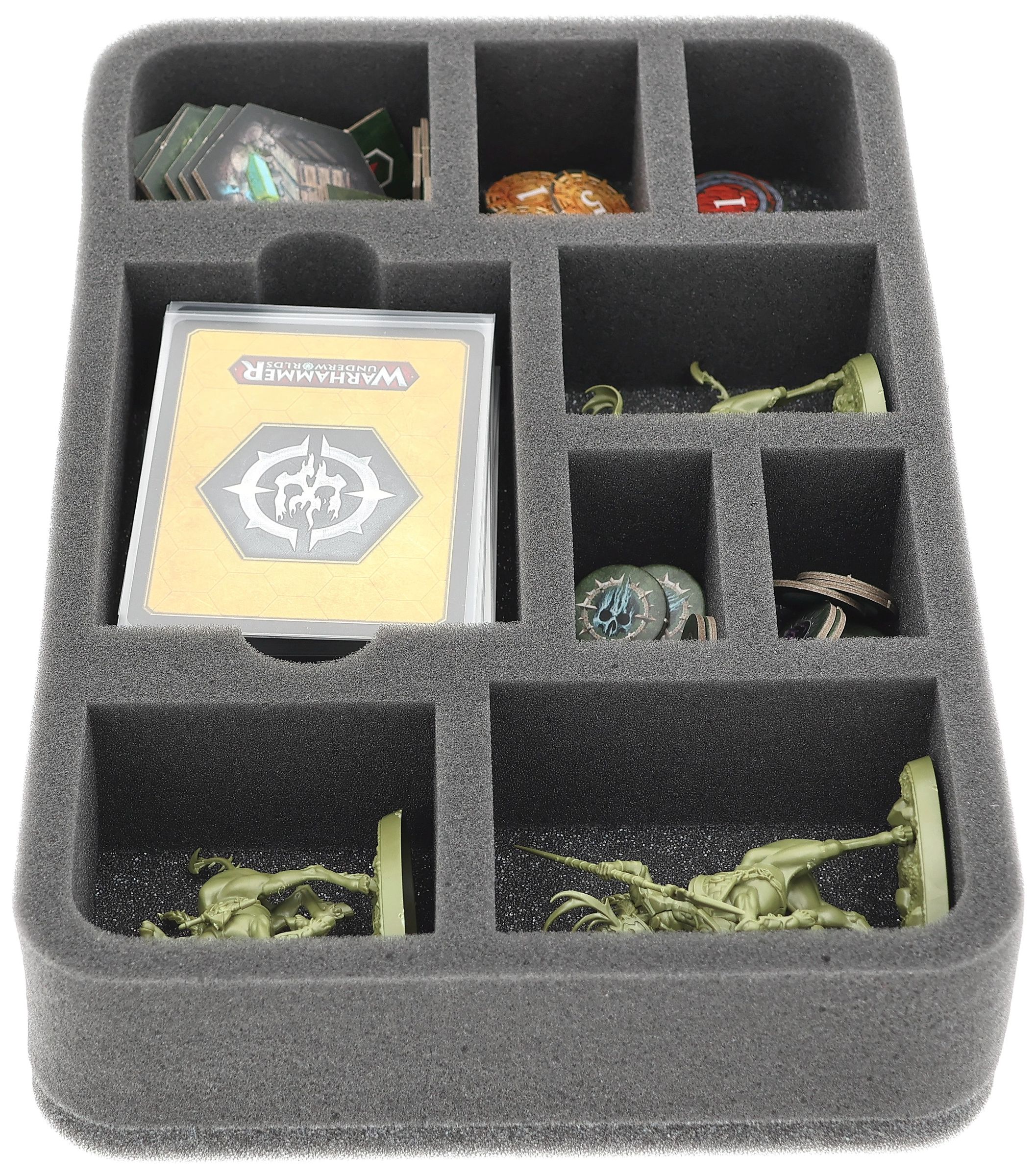 This Feldherr Half-Size foam tray provides space for the 3 models in your warband, as well as cards and tokens. The precise cut ensures a snug fit so that nothing can slip during transport. The high-quality foam ensures that delicate details are reliably protected. The colors of painted figures are also preserved and protected from color abrasion and scratches.