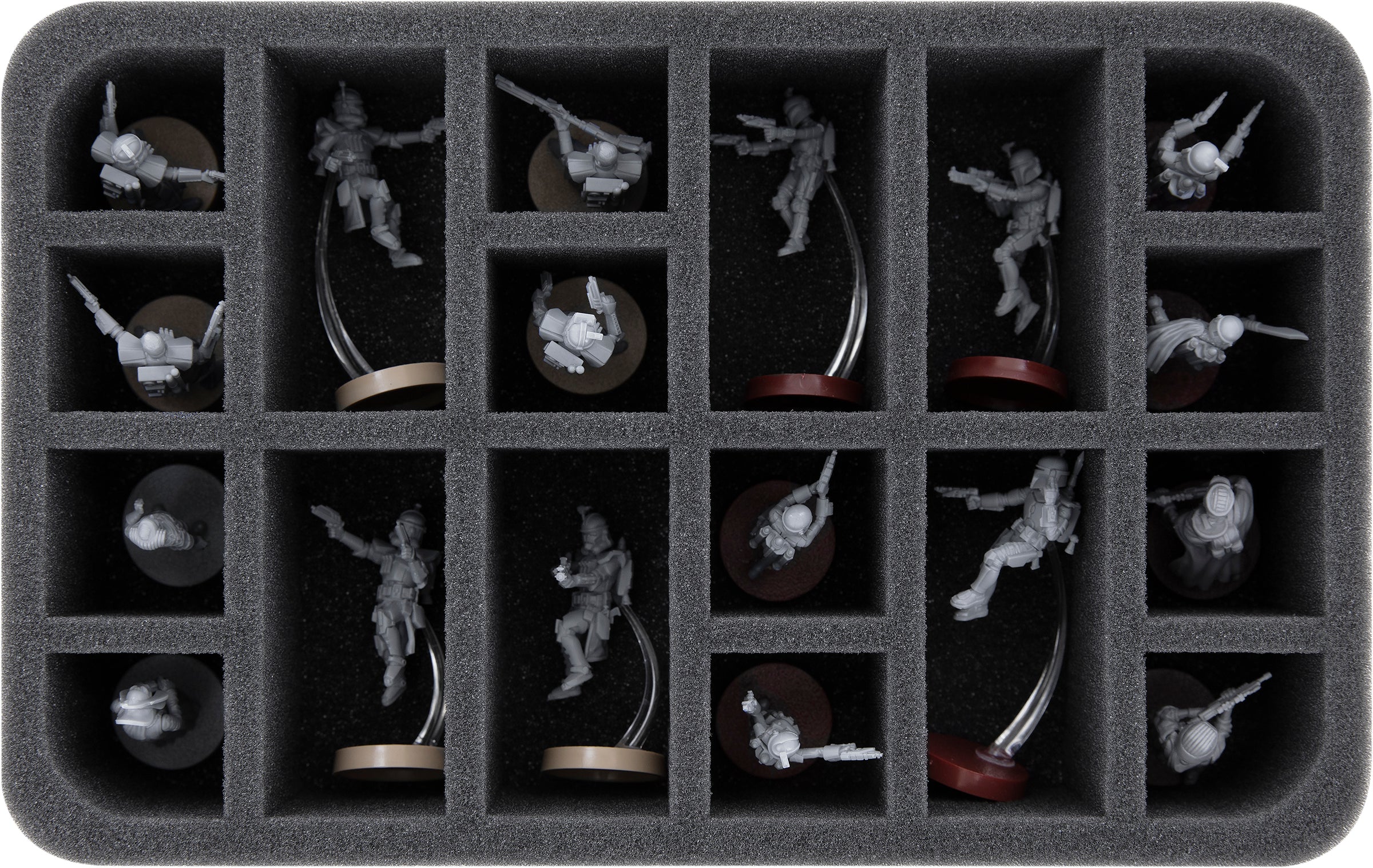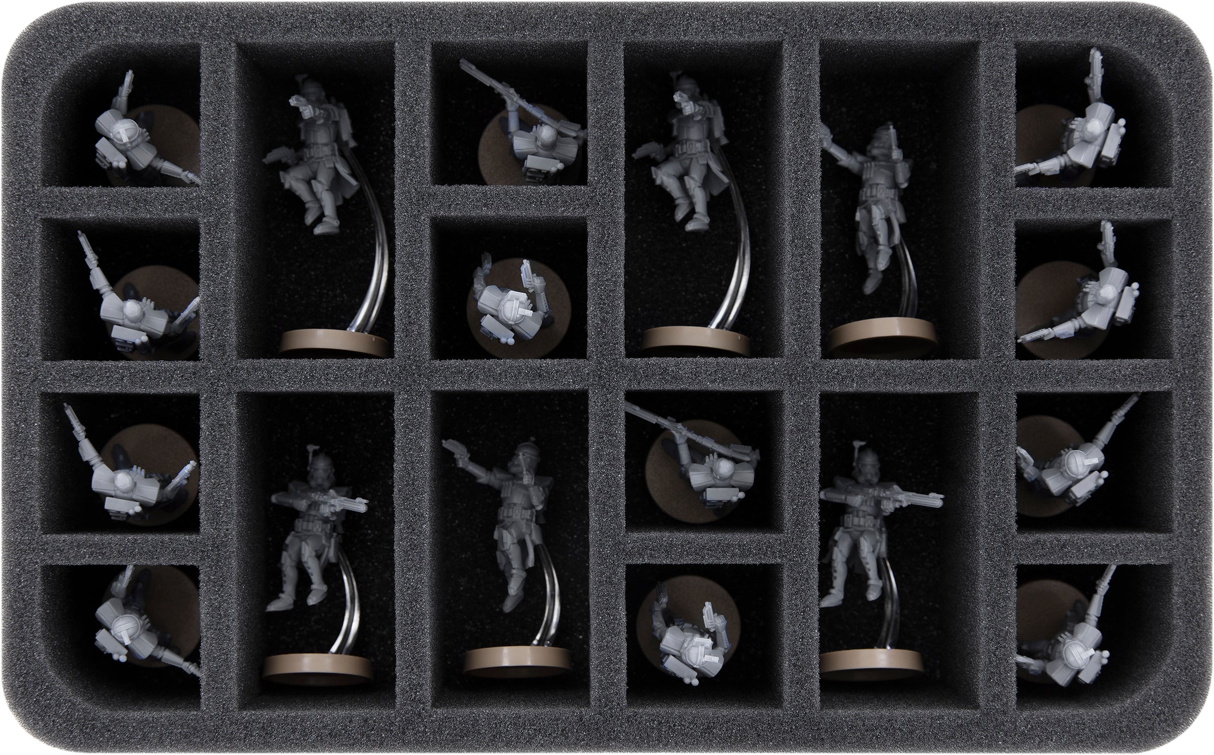 On this Feldherr foam tray you have space for a total of 18 miniatures. The insert has 6 oblong and 12 small compartments. It is therefore ideal for storing up to 6 ARC Troopers figures with jetpack and flight stands. The remaining 12 compartments are ideal for the units with standard dimensions.