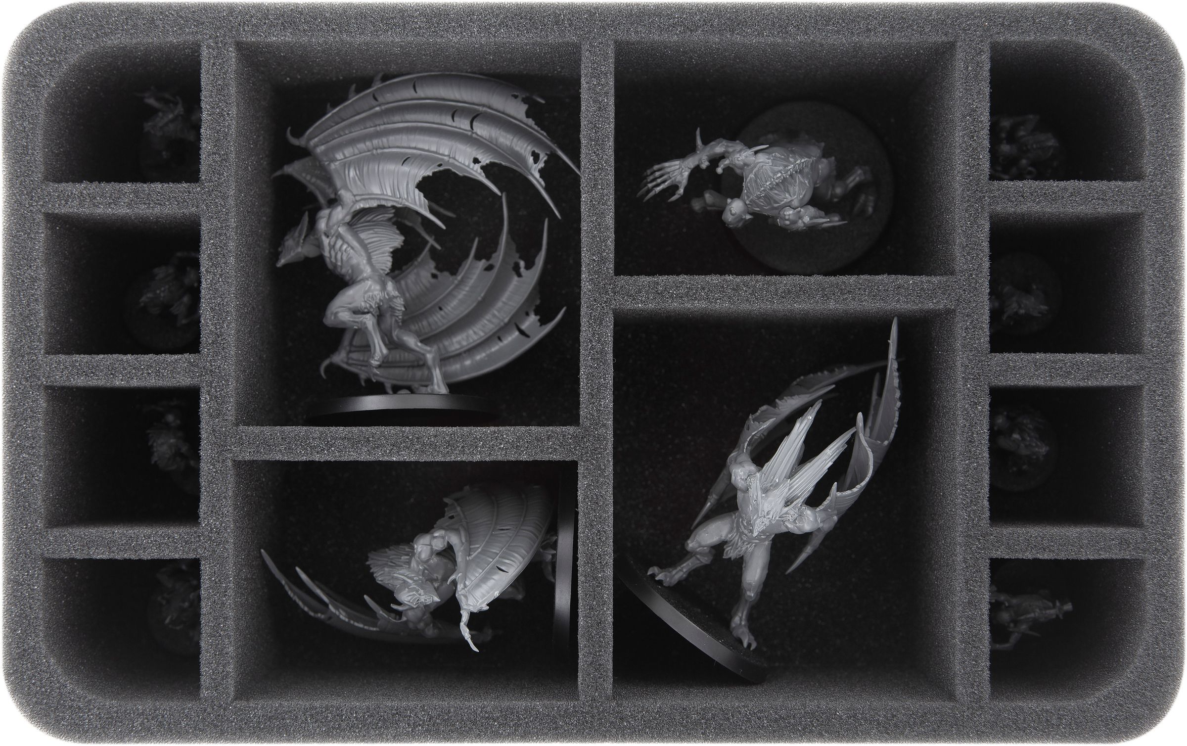 The 12 compartments on this Half-Size foam tray are divided into three different sizes. The insert is suitable for larger ghouls, as well as for small miniatures.