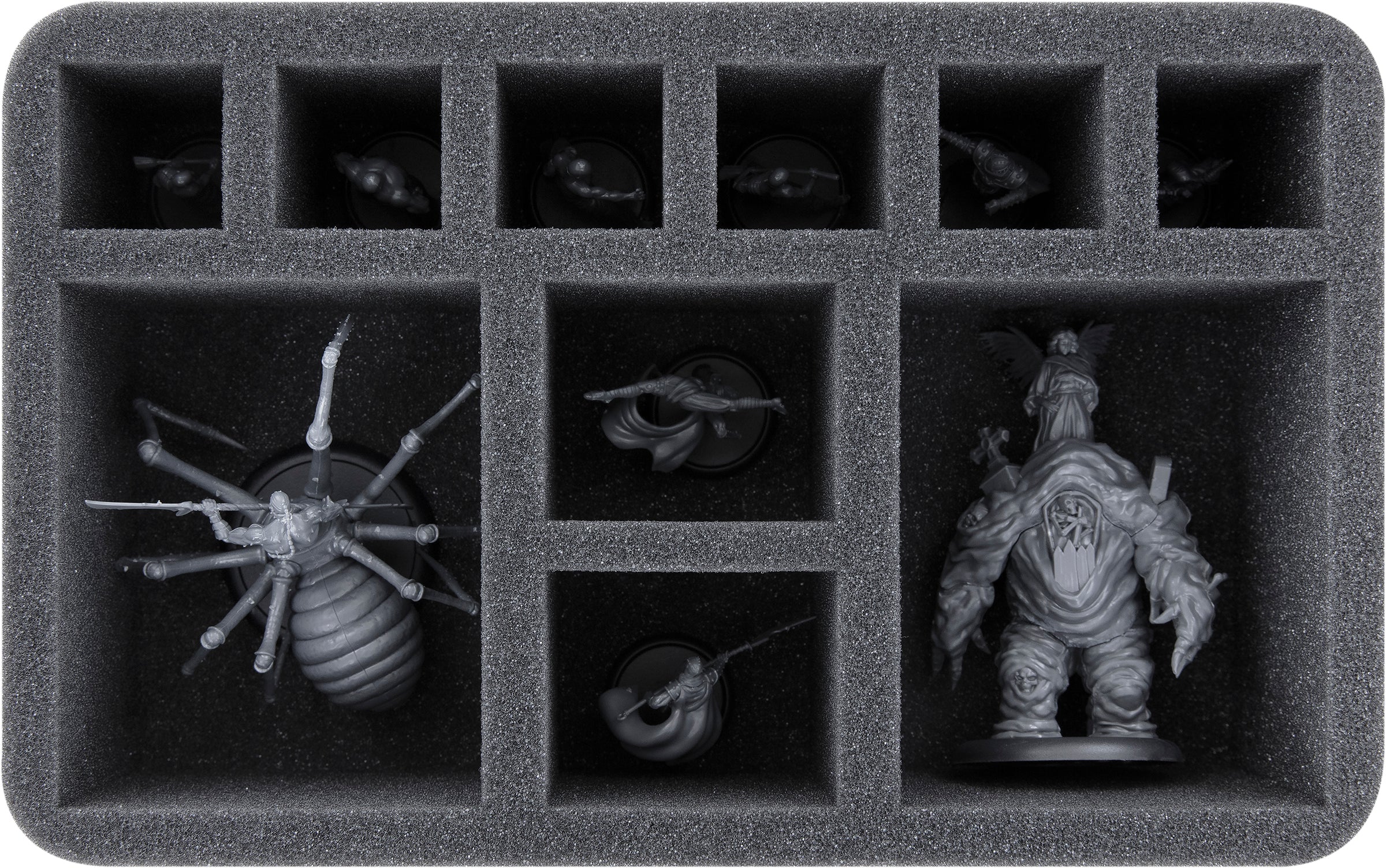 On this Feldherr Half-Size foam tray you have space for up to 10 miniatures of your crews. The insert is particularly suitable for storing models or game material. The insert is ideal for example for the miniatures like Jorogumo, Grave Golem and Shenlong.