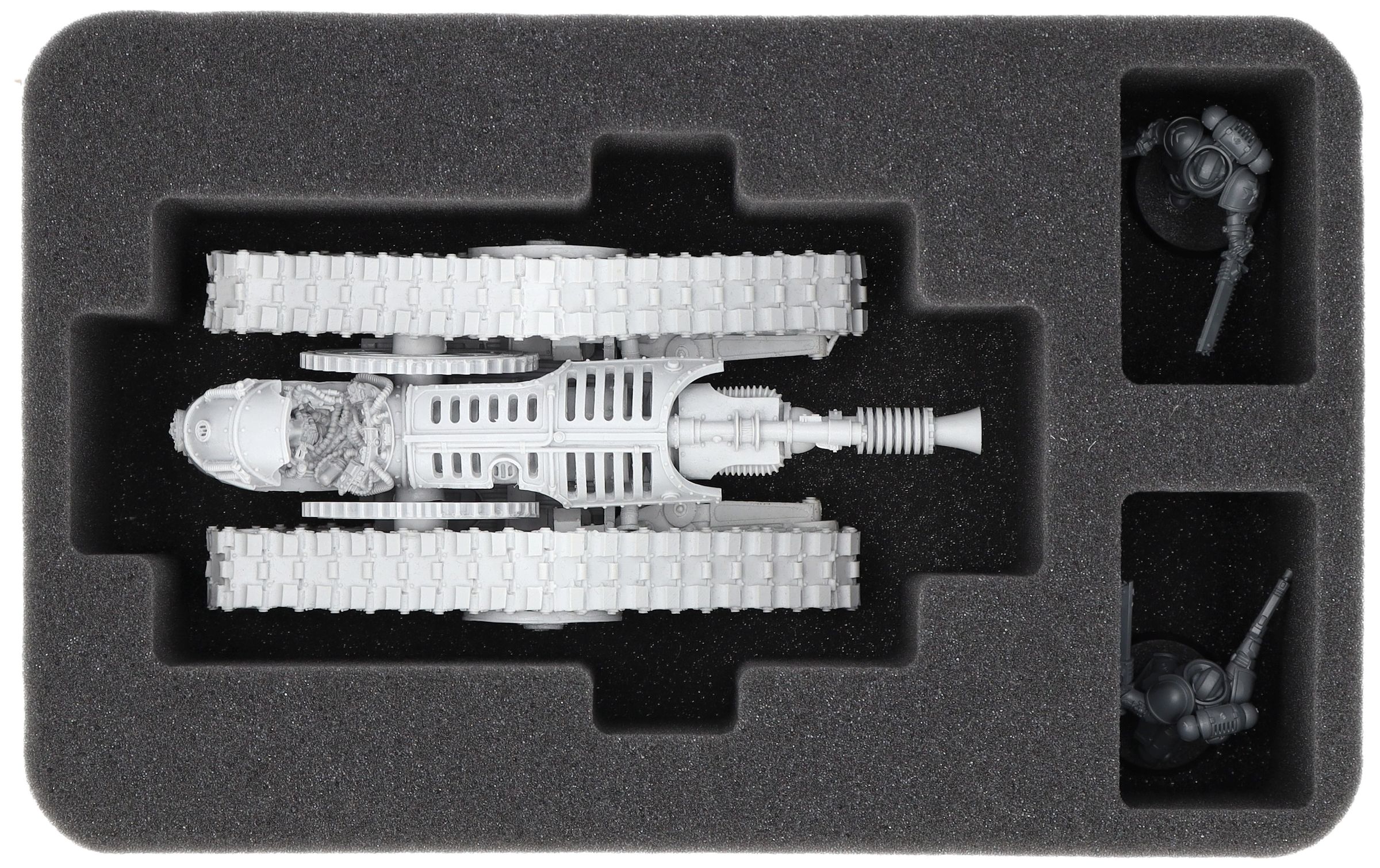 On this Feldherr foam tray you have space for up to 3 miniatures of your army. The insert is especially suitable for storing the Mechanicum Krios Battle Tank and similar sized models. The two adjoining compartments give you space for two smaller models.