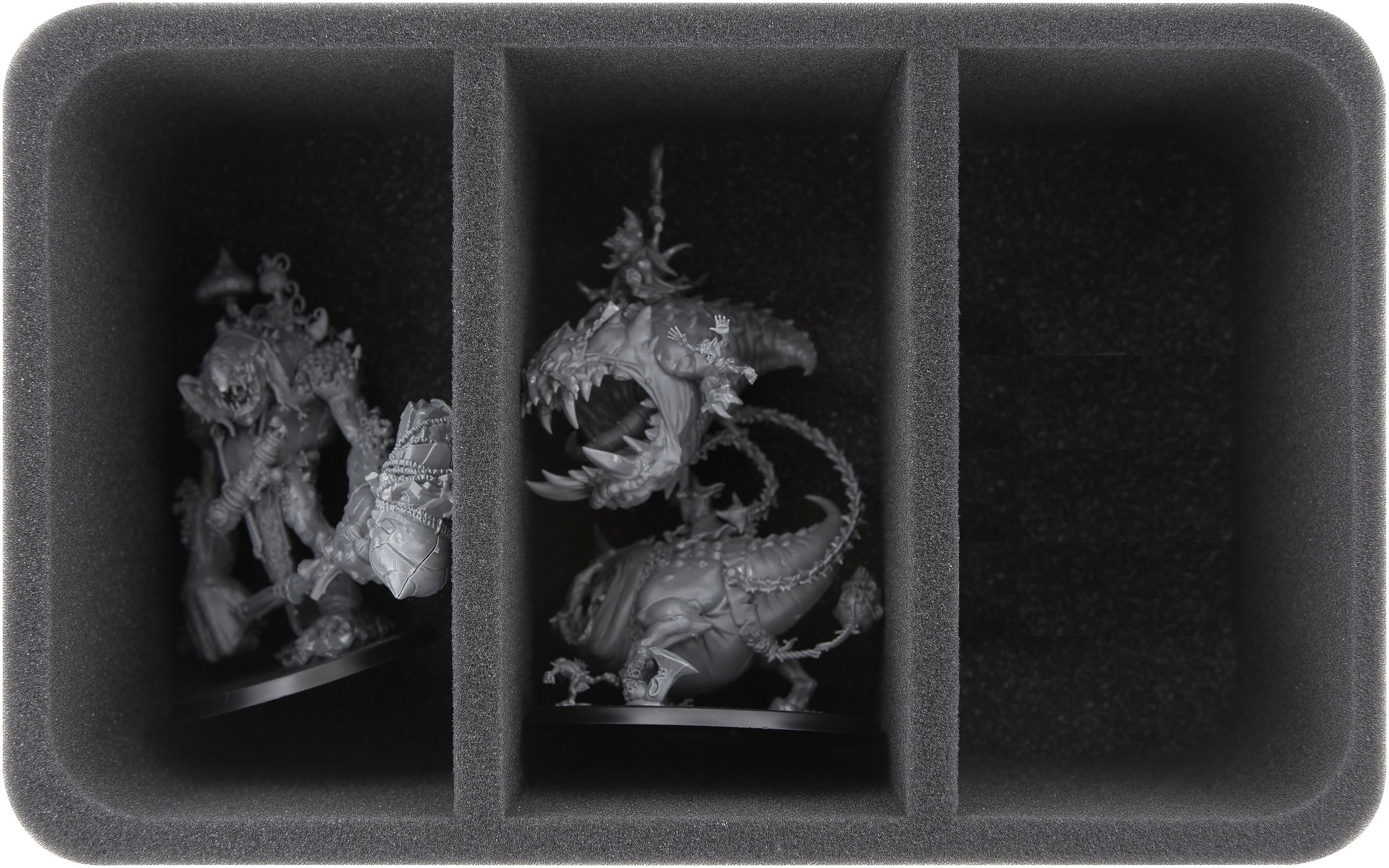 This Half-Size foam tray has 3 large compartments. It is ideal for storing larger Gloomspite Gitz models neatly and safely.