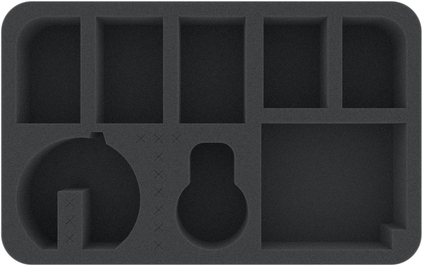 Die Abmessung der Schaumstoffeinlage ist 275 mm x 172 mm x 50 mm Höhe. Die Einlage bietet folgende Fächer: