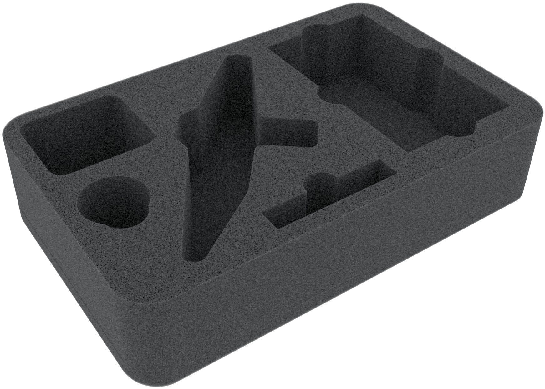The Feldherr half-size (HS) foam tray has the dimensions: 275 mm x 172 mm x 60 mm height. The 60 mm depth of the foam is result from 10 mm foam base and slot foam tray with 50 mm effective depth