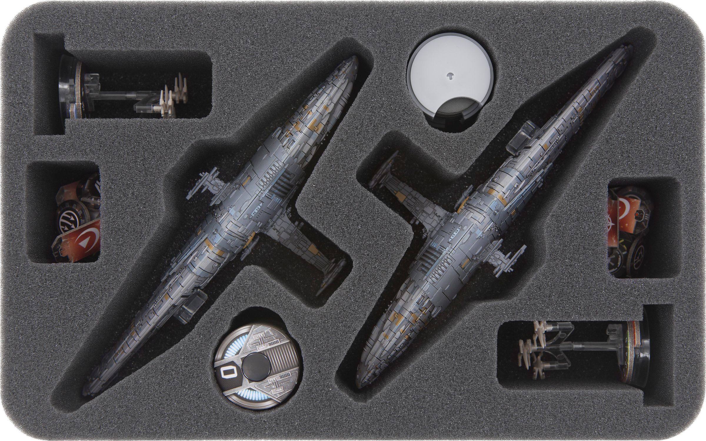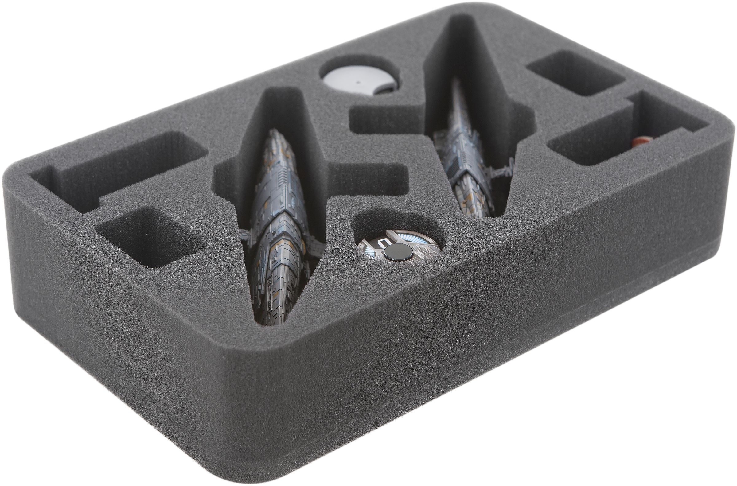 Protect you Star Wars Armada Profundity. In this Half-Size inlay you can store 2 MC75 Profundity. There are also cut-outs für dials and other ships. The foam tray is specially developed for MC75 Profundity. The entire game material and the cruiser are perfectly protected by the indiviually designed compartments.