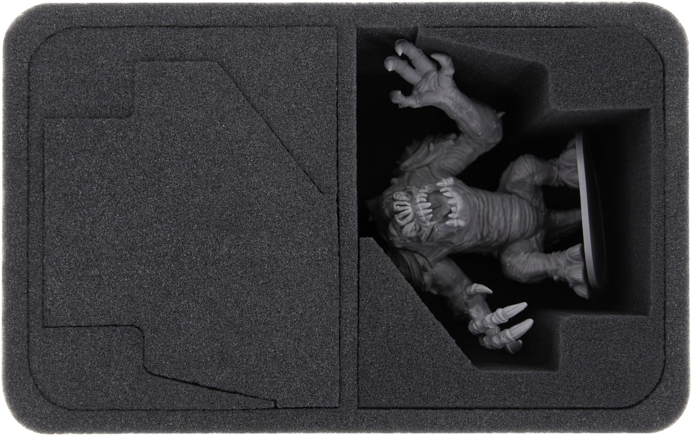 High quality foam tray for 2 very large and tall miniatures of different game systems. This foam tray has 2 slots - each slot 90 mm deep. Ready to use - glued 10 mm foam base.