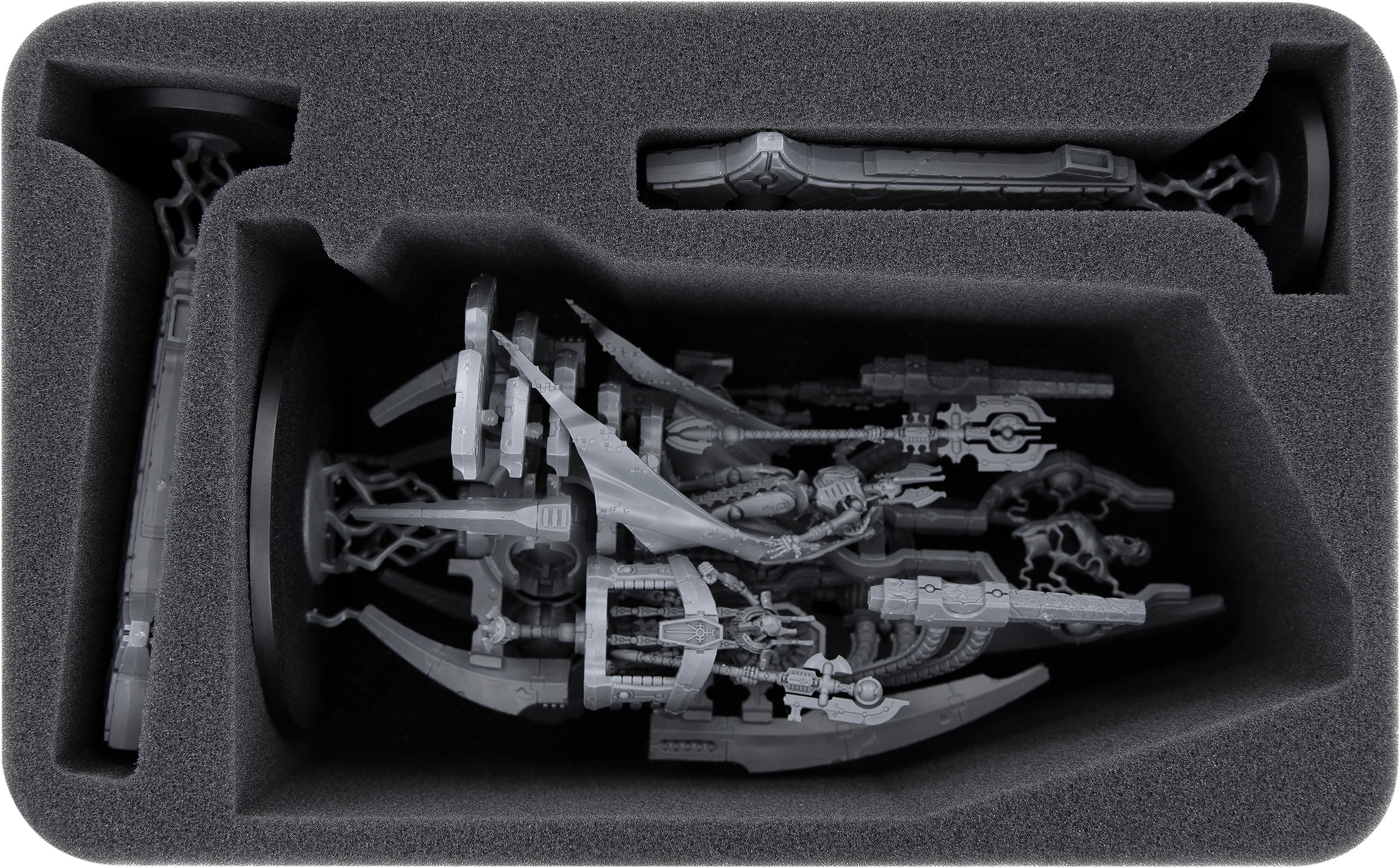 The large compartment is exactly tailored to the Dais of Dominion. The miniature-precise cut ensures that the miniature of Szarekh, the Silent King, is securely packed all around and stays in place even during transport. The high-quality foam material reliably protects the many filigree details of the model from damage. Colored miniatures are also spared from abrasion, flaking paint and scratches.