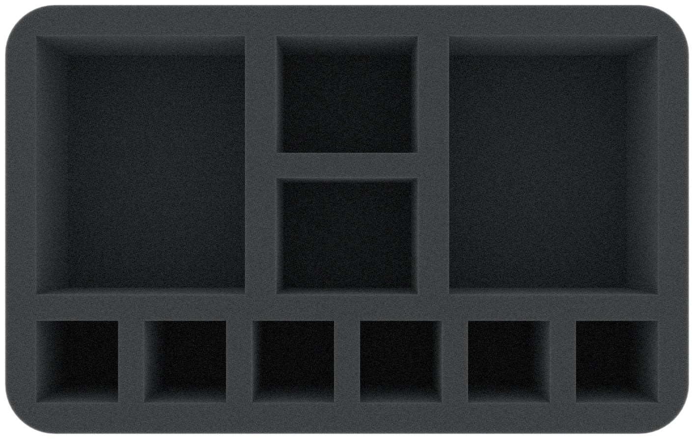 This 80 mm high foam tray is divided into 10 compartments. It is particularly suitable for the safe storage of tabletop and board game miniatures, as well as other fragile models and small parts.