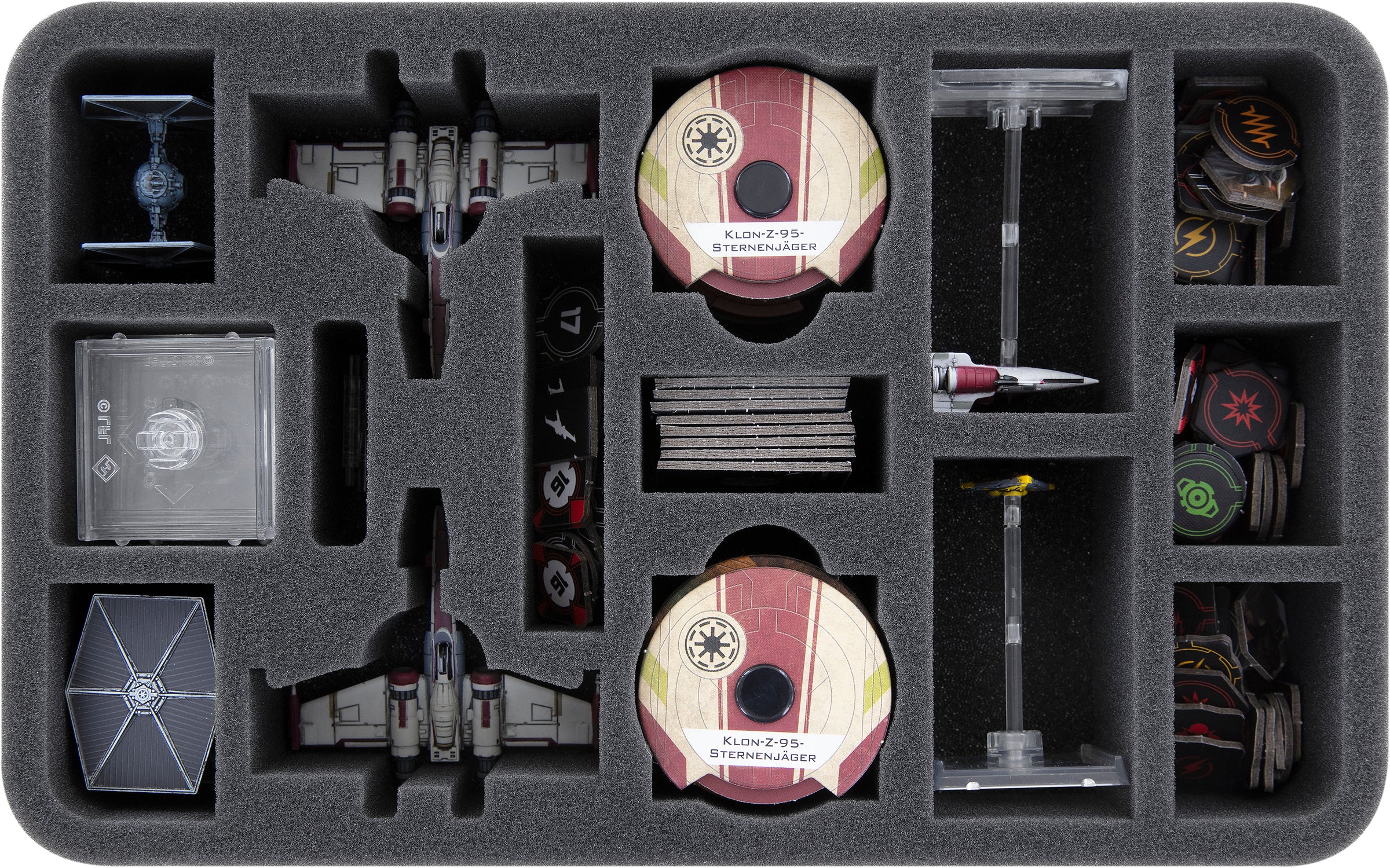 This Feldherr Half-Size foam tray provides the necessary squash zone. With it, your fighters are optimally protected even at high speeds. Both Clone Z-95 Starfighters receive custom compartments. The fighters won't slide around in the insert during transport, thanks to the custom-fit cut. The colors of the painted miniatures are preserved and spared from abrasion and scratches.