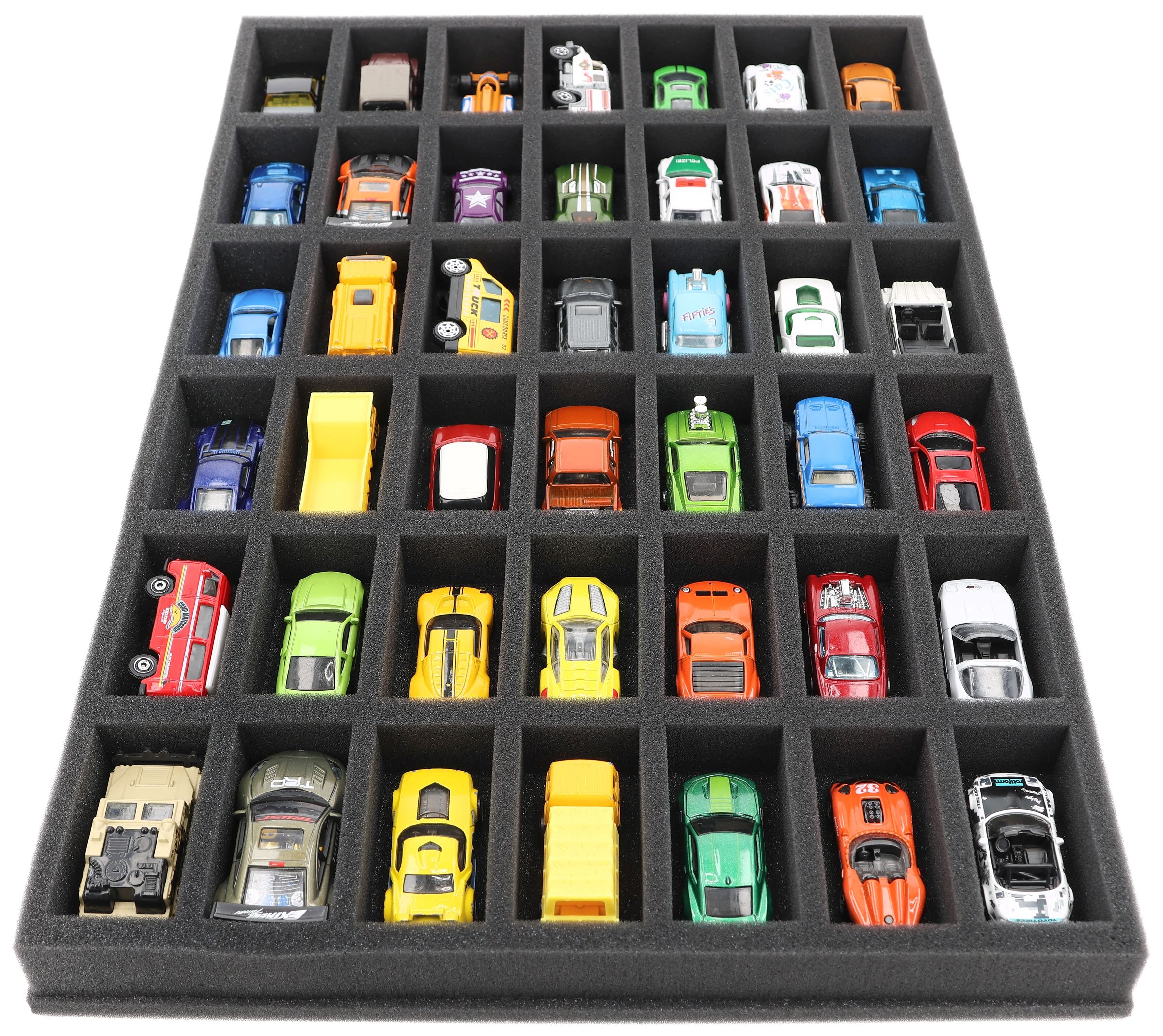 Whether for safe storage on the shelf or transportation to the next trade fair - with this Feldherr foam insert, your 1:64 scale model cars remain reliably protected. The 42 compartments fit the vehicles perfectly and protect them from scratches, paint abrasion and damage caused by slipping.