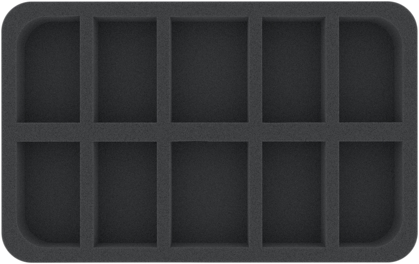This Half-Size foam tray is divided into 10 compartments. It is particularly suitable for the safe storage of small to medium-sized figures for various board games and tabletop systems. Game material or other small parts can also be neatly stowed here.