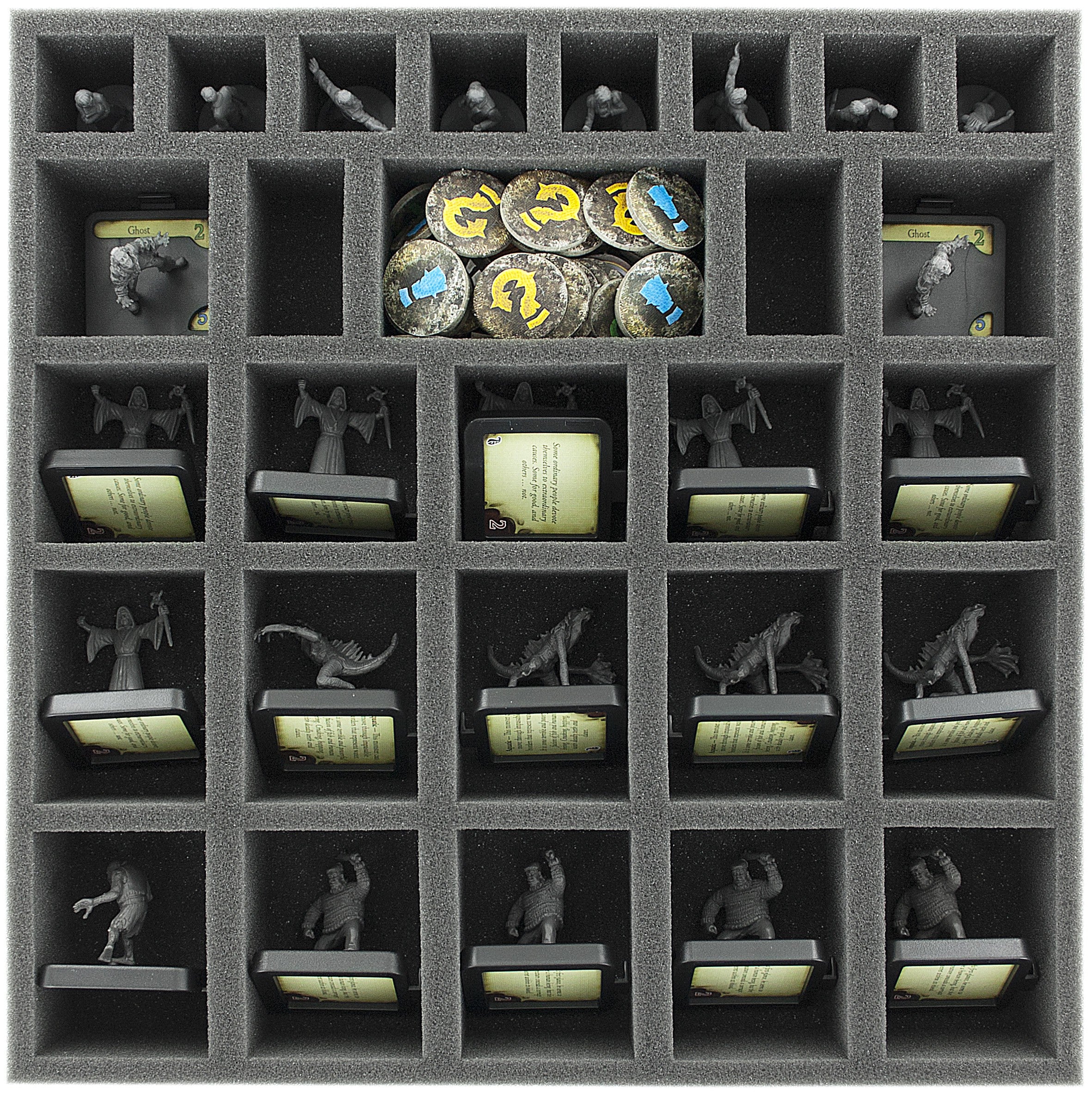 Foam tray especially for Mansions of Madness. The 28 different sized compartments are suitable for all conceivable game material like monsters, tokens or investigators.