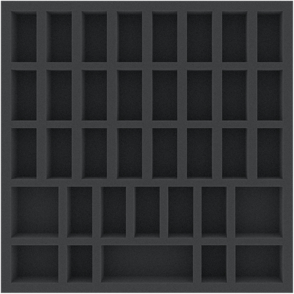 This foam tray has 36 compartments for the safe and orderly storage of small miniatures, tokens or dice. The fine-pored foam provides reliable protection against damage – fragile parts stay intact, surfaces don’t get scratched.