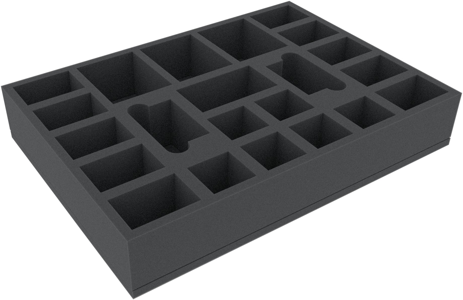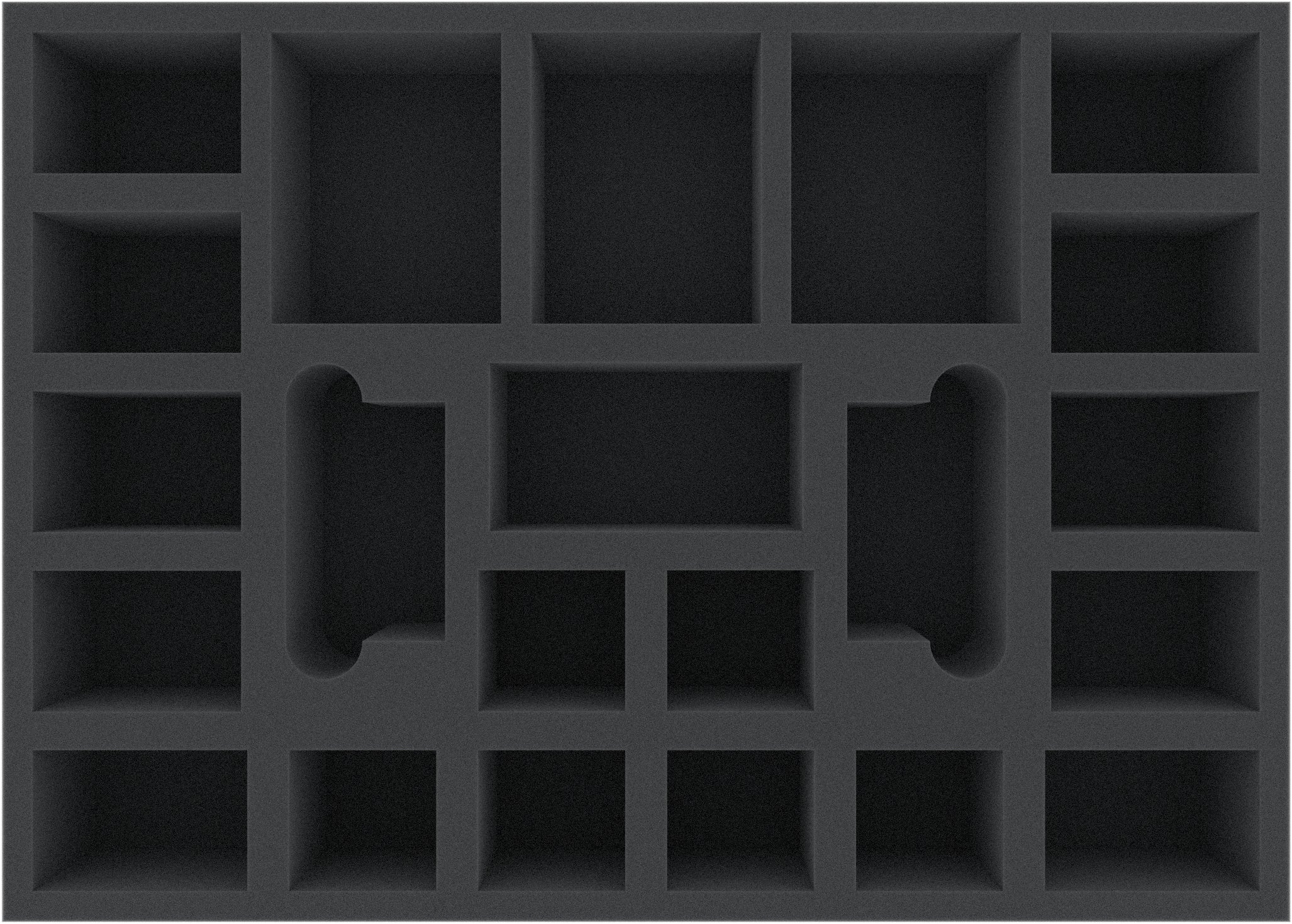 This 70 mm high foam tray is divided into 22 compartments. It is particularly suitable for the safe storage of tabletop and board game miniatures, as well as other fragile models and small parts.