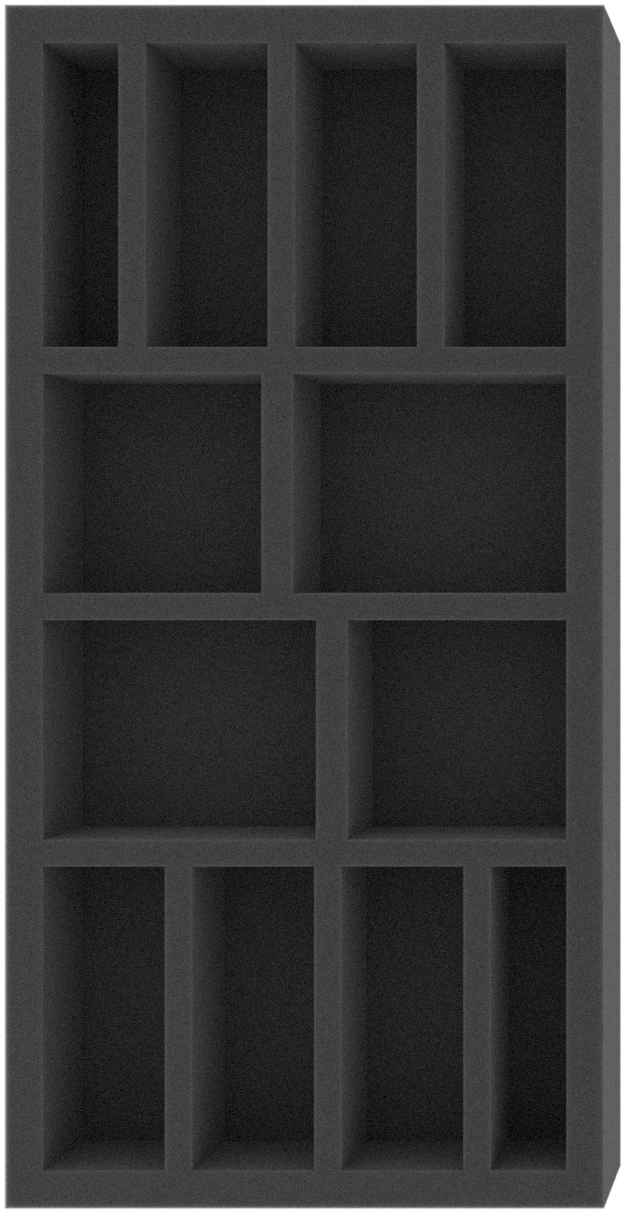 This 40 mm high foam tray is divided into 12 compartments. It is particularly suitable for the safe storage of tabletop and board game miniatures, as well as other fragile models and small parts.