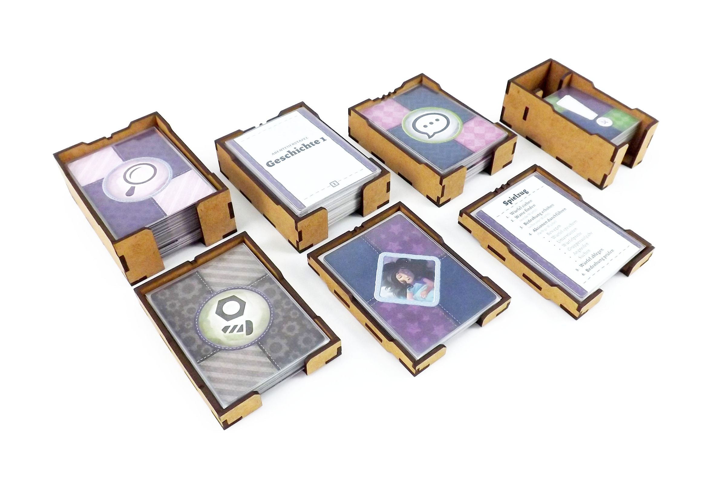 When stuffed animals set out to defend their girl from nightmare creatures they risk to get lost in her dreams. To prevent players from getting lost in the many card decks and to properly store the beautiful miniatures, our organizer provides custom storage for all components and creates order under the children's bed.