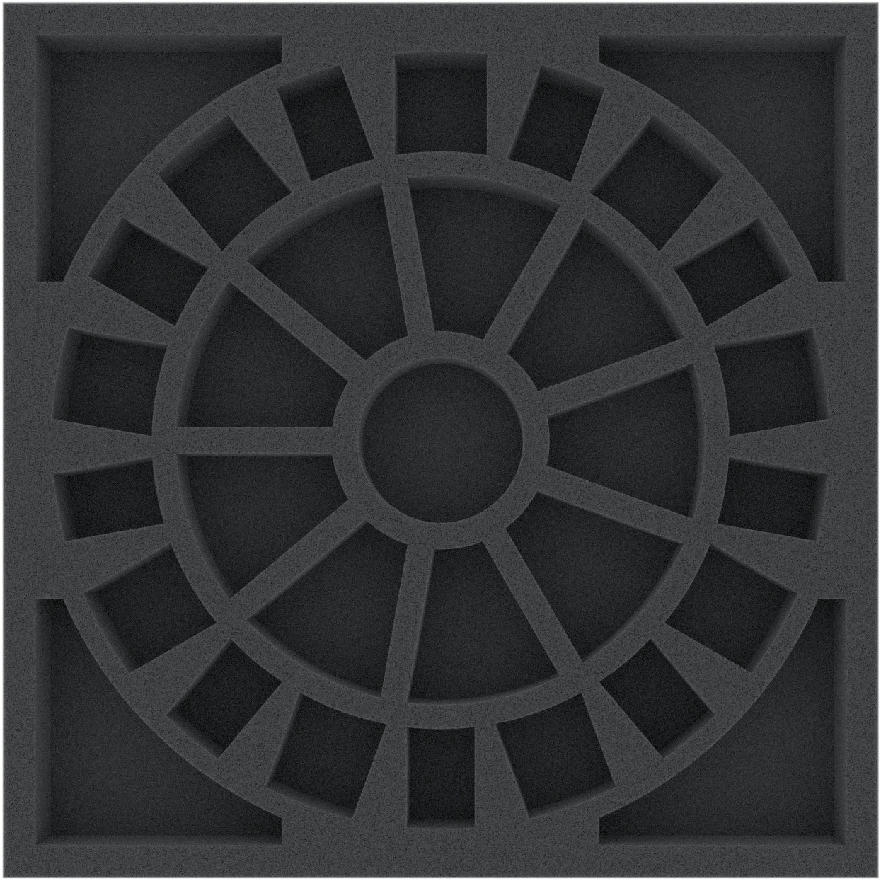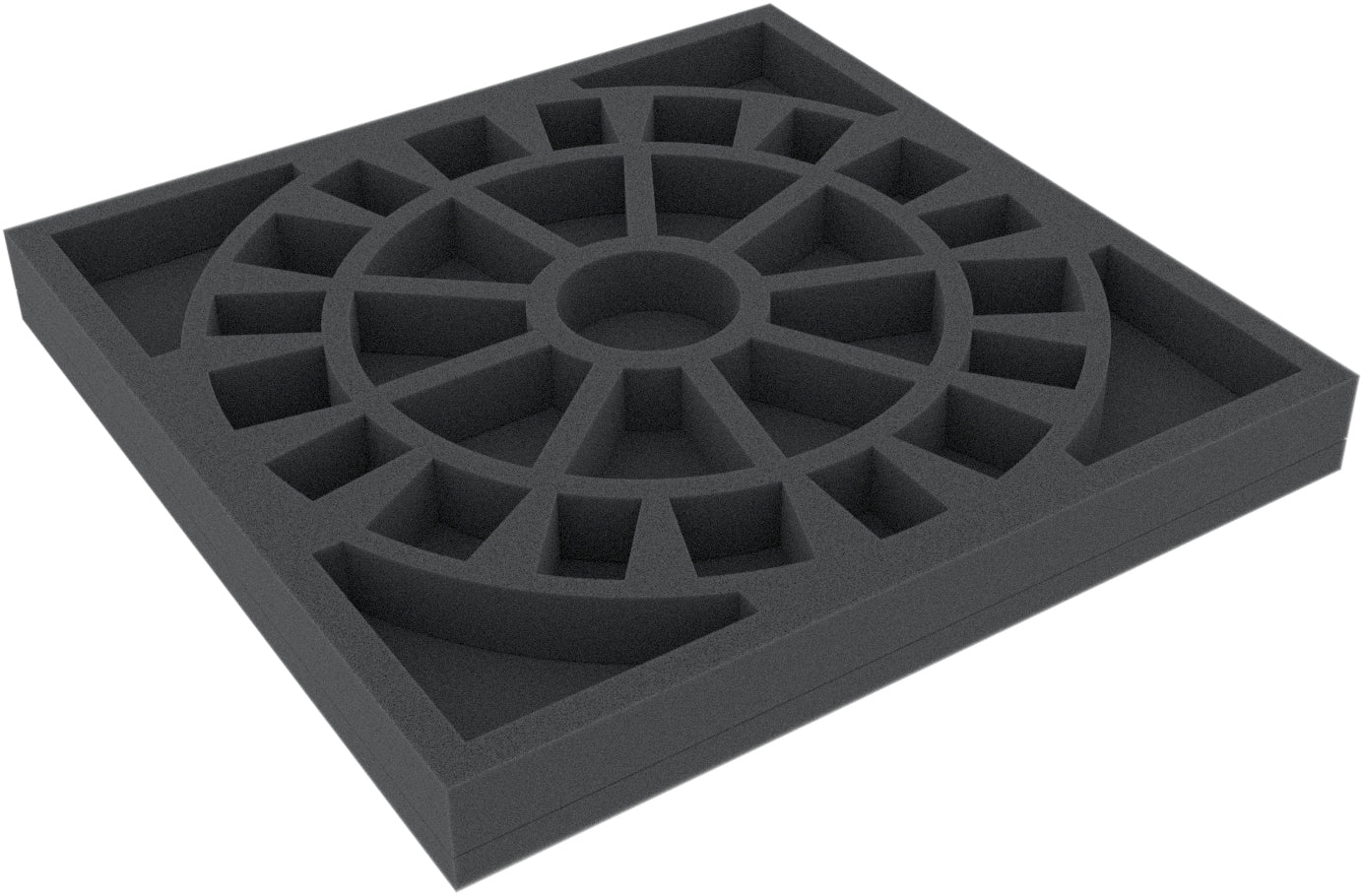 The foam tray has the following dimensions: 265 mm x 265 mm x 30 mm total height (20 mm usable height + 10 mm foam base).