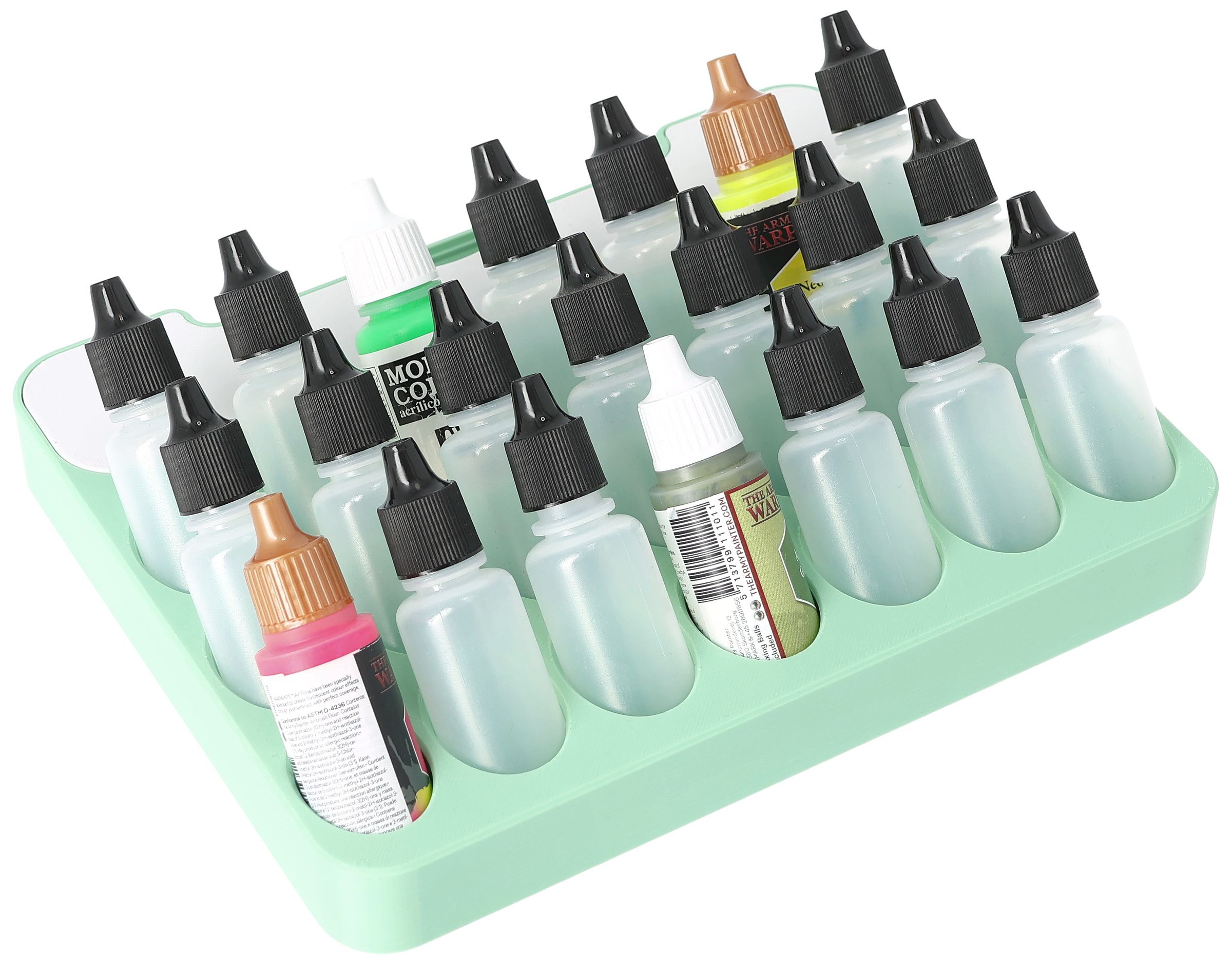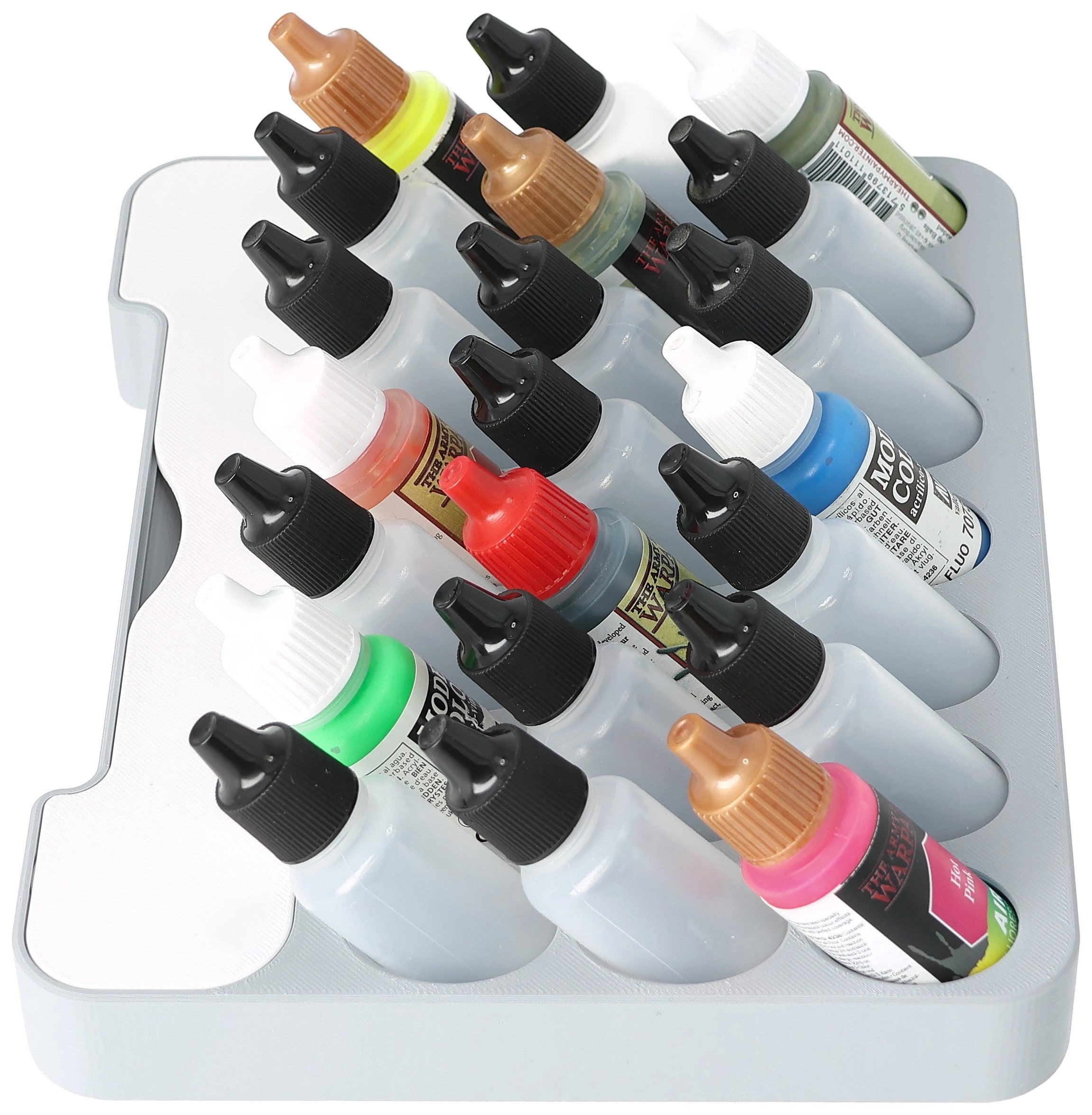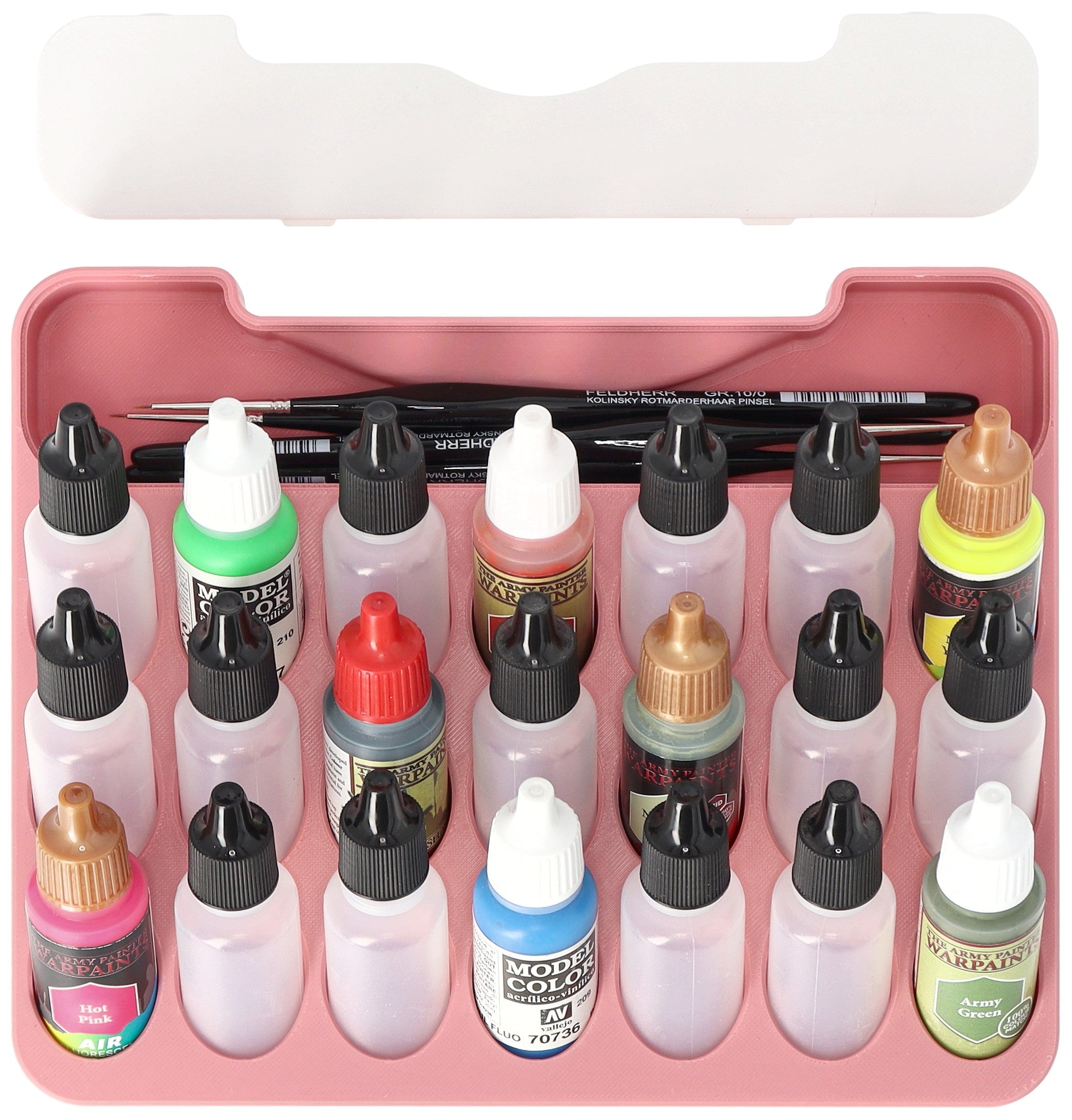 • Paint rack with 21 round compartments for paint bottles with a diameter of 25 mm - compatible with dropper bottles from Vallejo (17 ml), Army Painter (18 ml) and other common formats