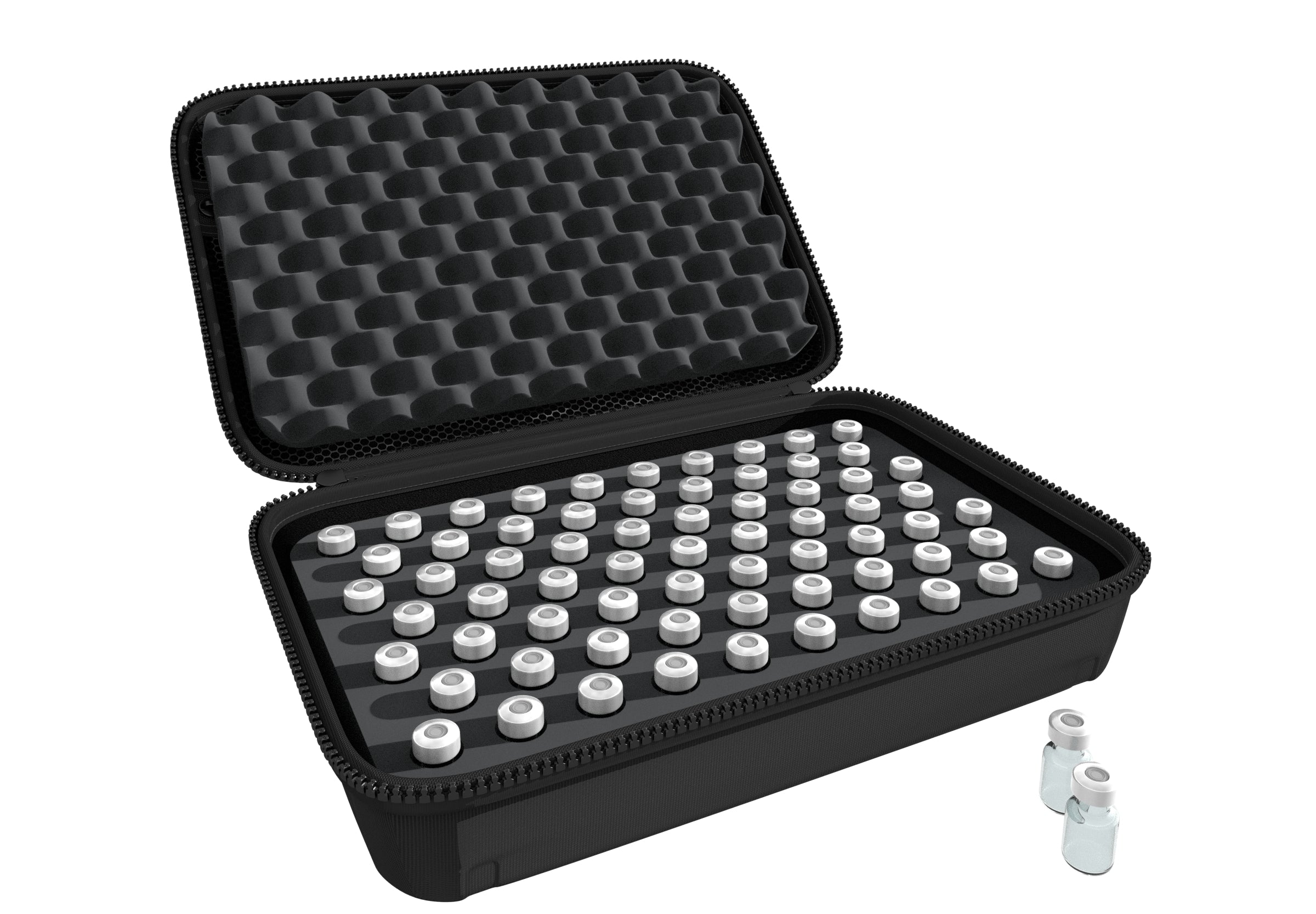 The glass vials are securely surrounded by foam. Thanks to the precise cut and the shock-absorbing material, the vials are optimally protected for transport.