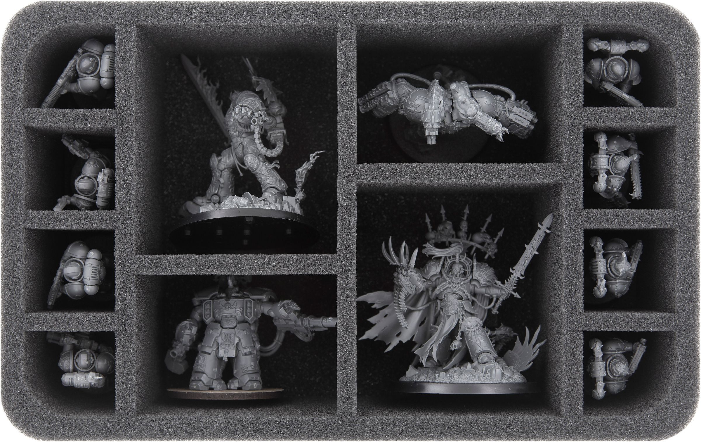 The two HSCW075BO-trays have 12 compartments each. The two large compartments on each of the trays are suited for the Commander of the Black Legion Abaddon the Despoiler. The two medium-sized compartments of each of the two trays can be filled with e. g. Obliterators. The eight small compartments of both trays will hold standard warriors of the Heretic Astartes-Legion.