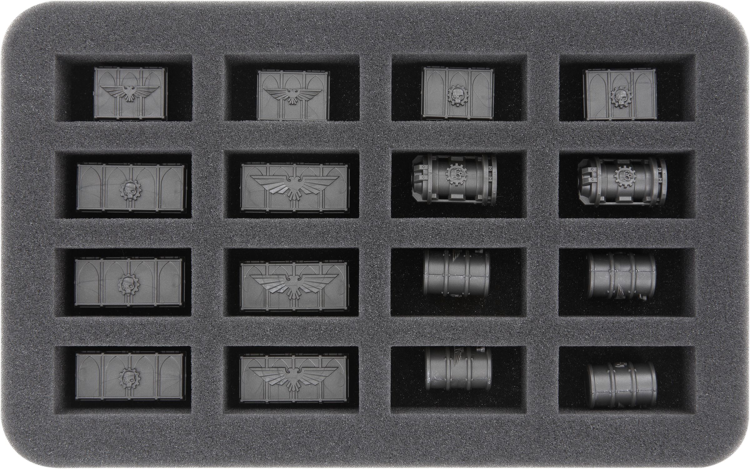 The three foam trays for the scenery miniatures allow you to safely store all doors, barrels, crates, pipes and cylindrical containers of the Arena-expansion. The fine-pored foam ensures the best possible protection of your models. Delicate parts remain intact, color remains unharmed.