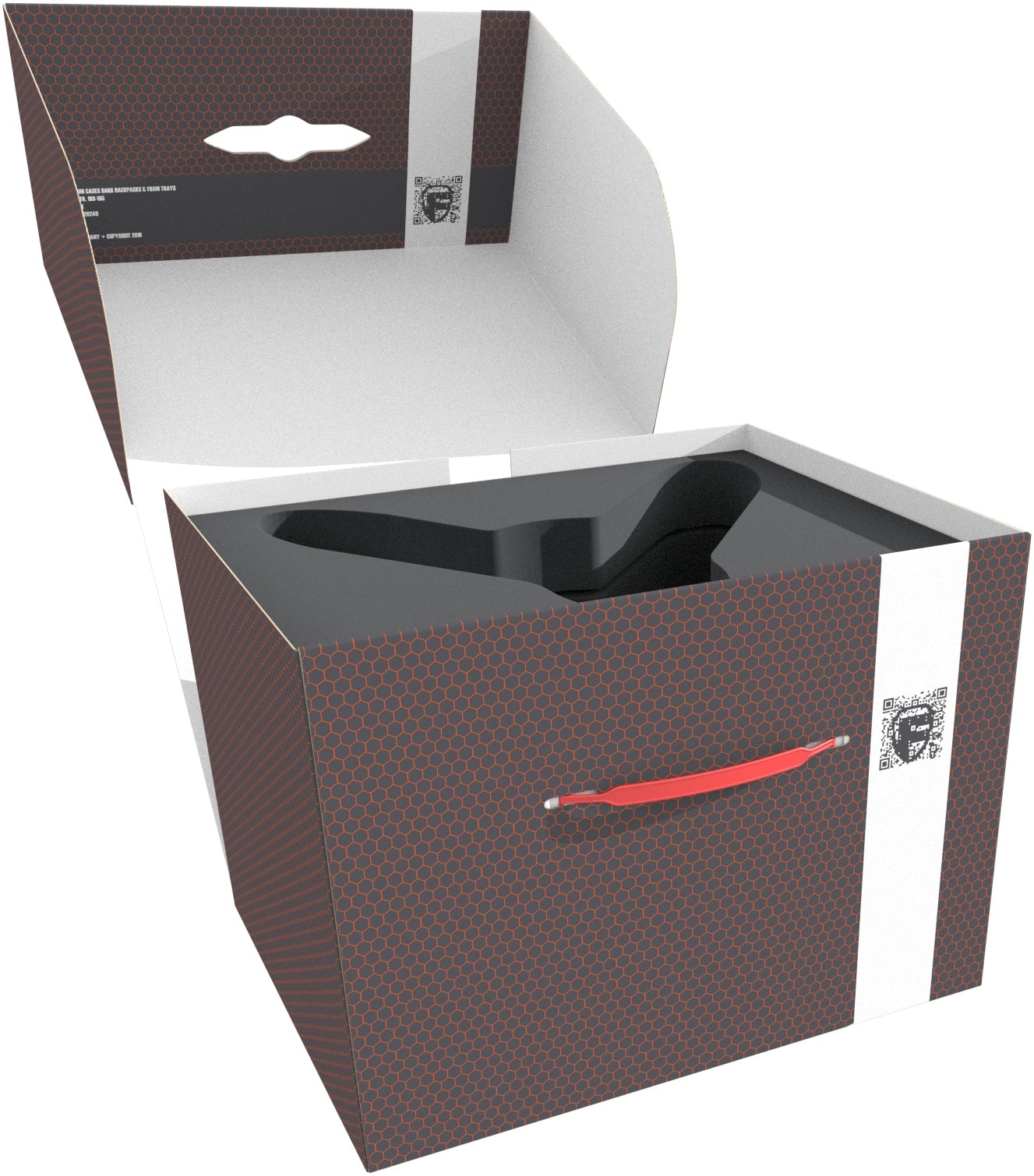The Storage Box FSLB250 is made of coated, double-walled cardboard and is therefore very light and yet stable. The practical carrying handle makes the box easy to transport. One side of the box can be opened completely. This makes it easier to put in and take out the foam inserts.
