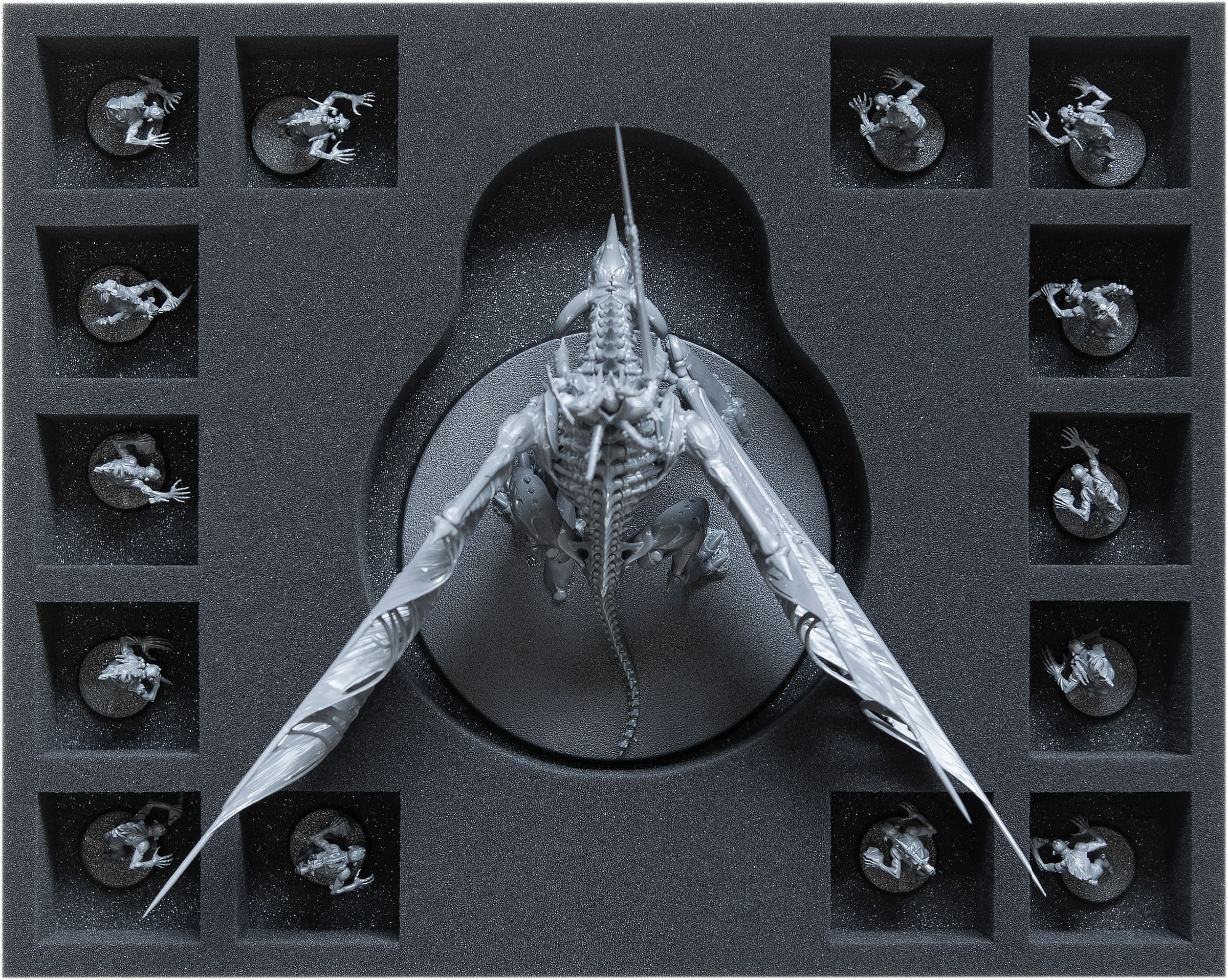 To ensure that the rest of the figure is also securely packed in foam, the other two inserts are attached on top. These are provided with a recess cut to the exact miniature size. This provides optimum protection against damage to the sensitive wings and all other filigree details. When the miniature is finally painted after hours of intensive work, you can relax (at least until the next battle), because the colors are also safe from abrasion and scratches here.