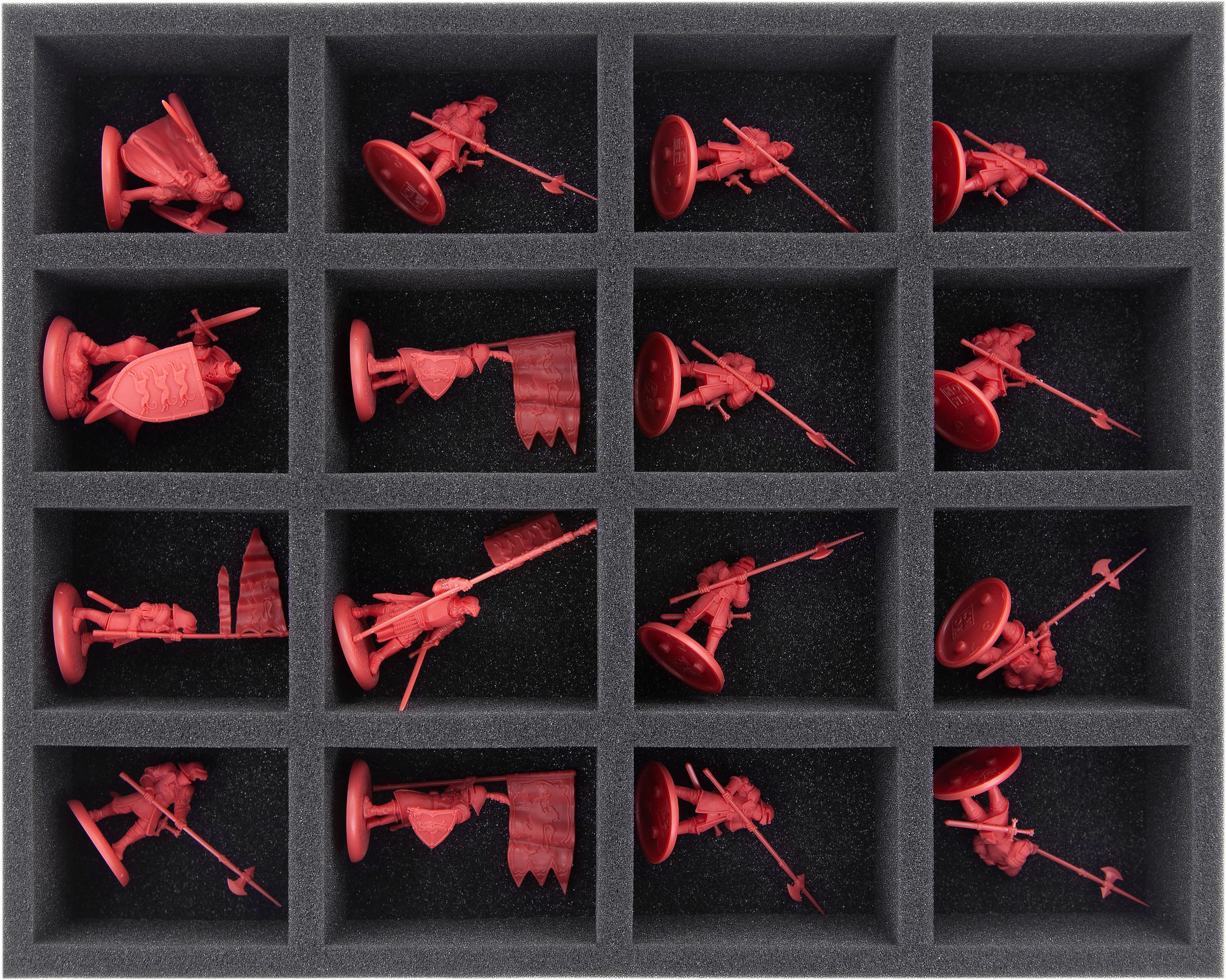 Standard-infantry or models with protruding poses, can be stored on the 25-compartment foam tray.