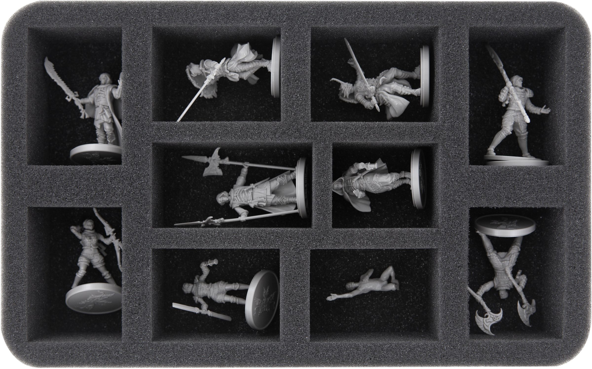 The foam topper provided ensures that all miniatures are completely surrounded by foam and that the figures of the upper insert do not bump against the lid of the box during transport.
