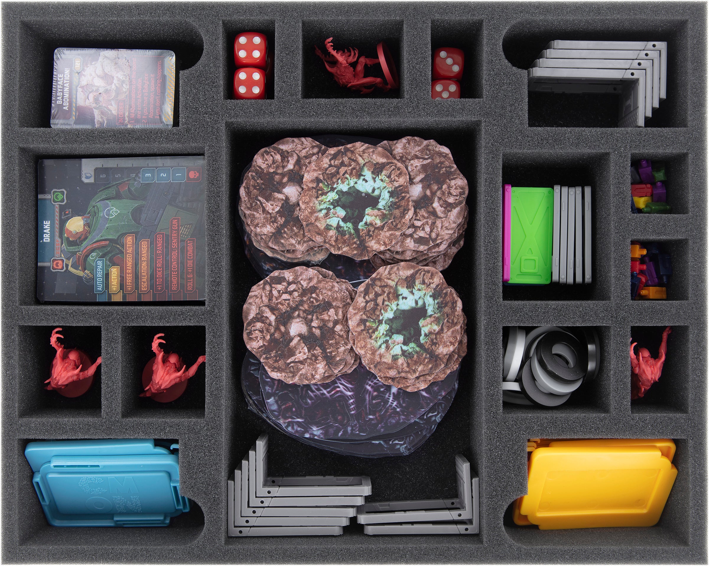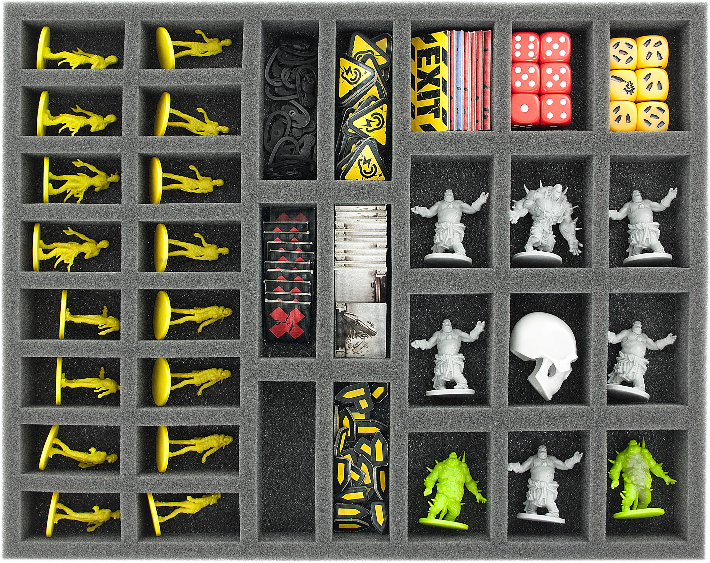 The rulebook, cards and game materials are stored in the Full-Size tray with the large compartment (FS050I031BO). Dashboards, Trackers, Survivor Color bases and the various tokens can be sorted into the two 55 mm high inserts FSFG055BO.