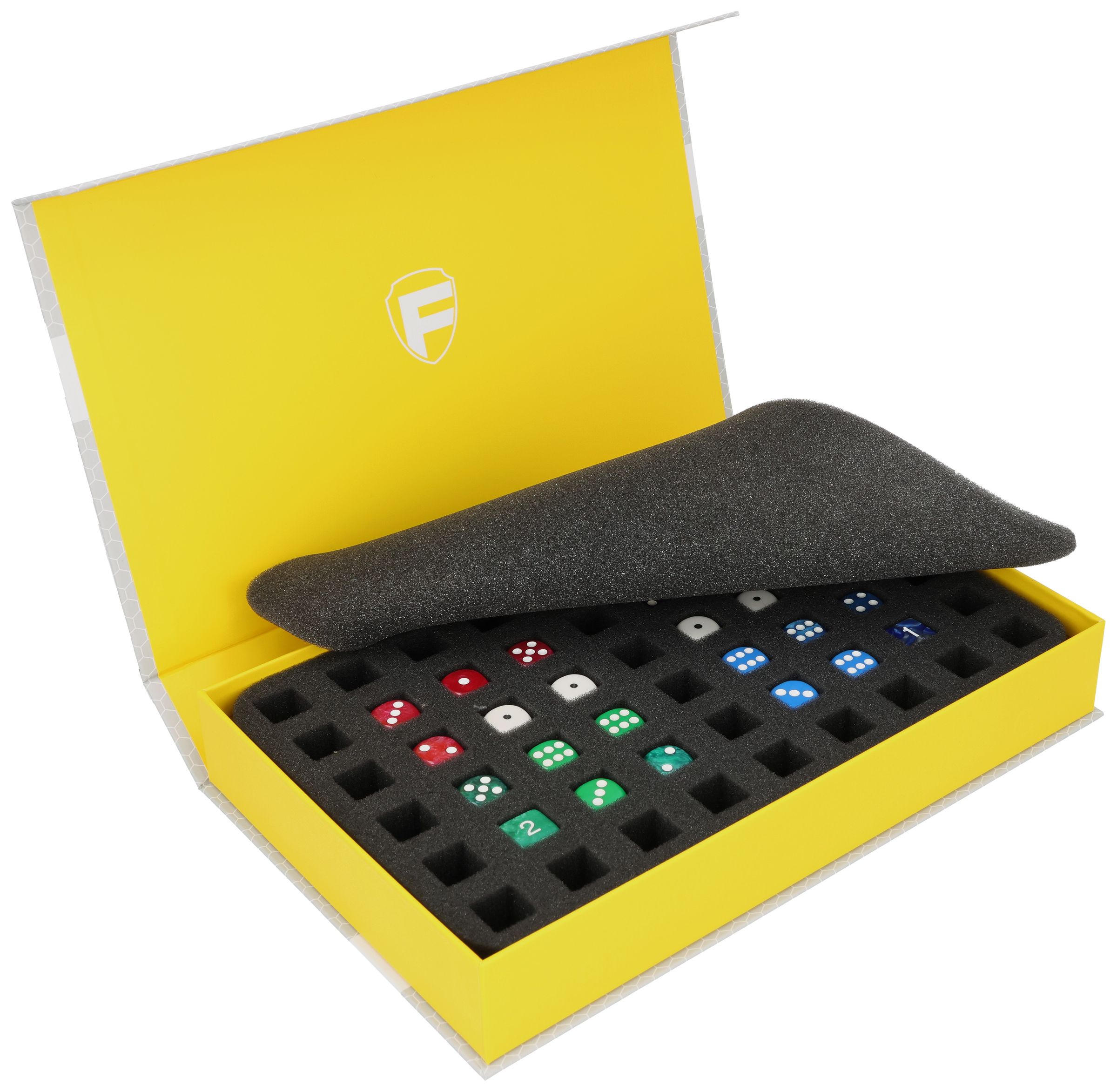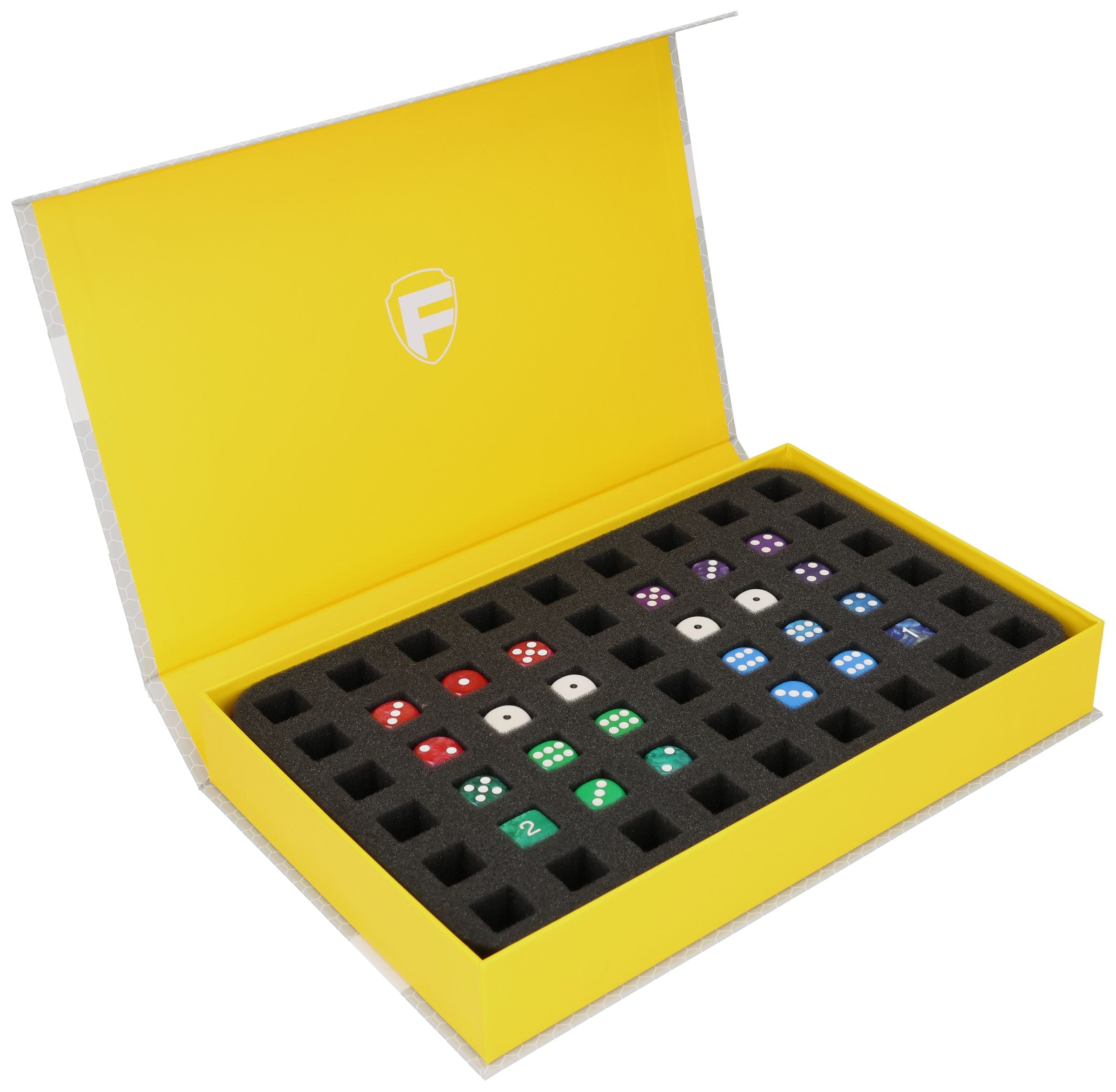 The yellow Magnetic Box from Feldherr offers a safe space for up to 54 dice with an edge length of 16.5 mm without them rubbing against each other. The empty box can also be used as a dice tray, perfect for table-top games such as Blood Bowl and Zombicide.