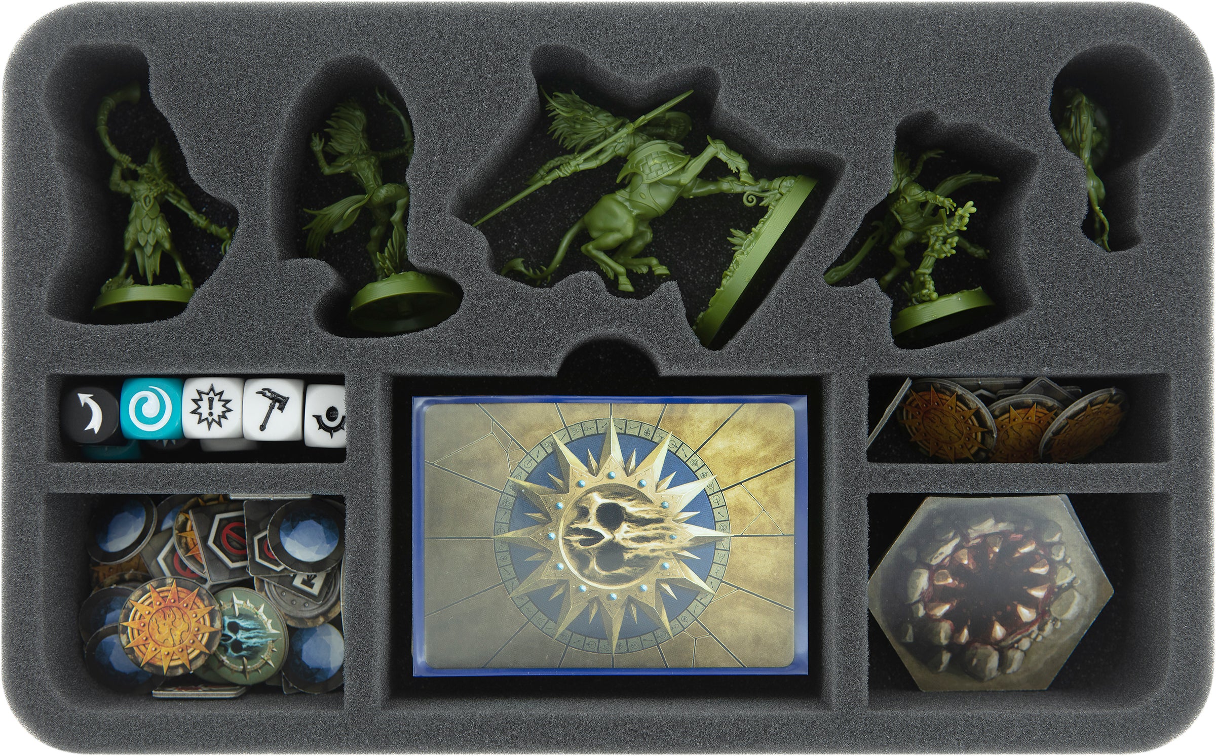 The insert is divided into 12 compartments for safe and clear storage of miniatures and game material. Six of them are individually designed for 'Grashrak's Despoilers'. Grashrak's Fellhoof and its Ungor herd, consisting of Draknar, Gnarl, Ushkor, Murghoth Half-Horn and Korsh, the Sneak, are safely embedded in soft foam.