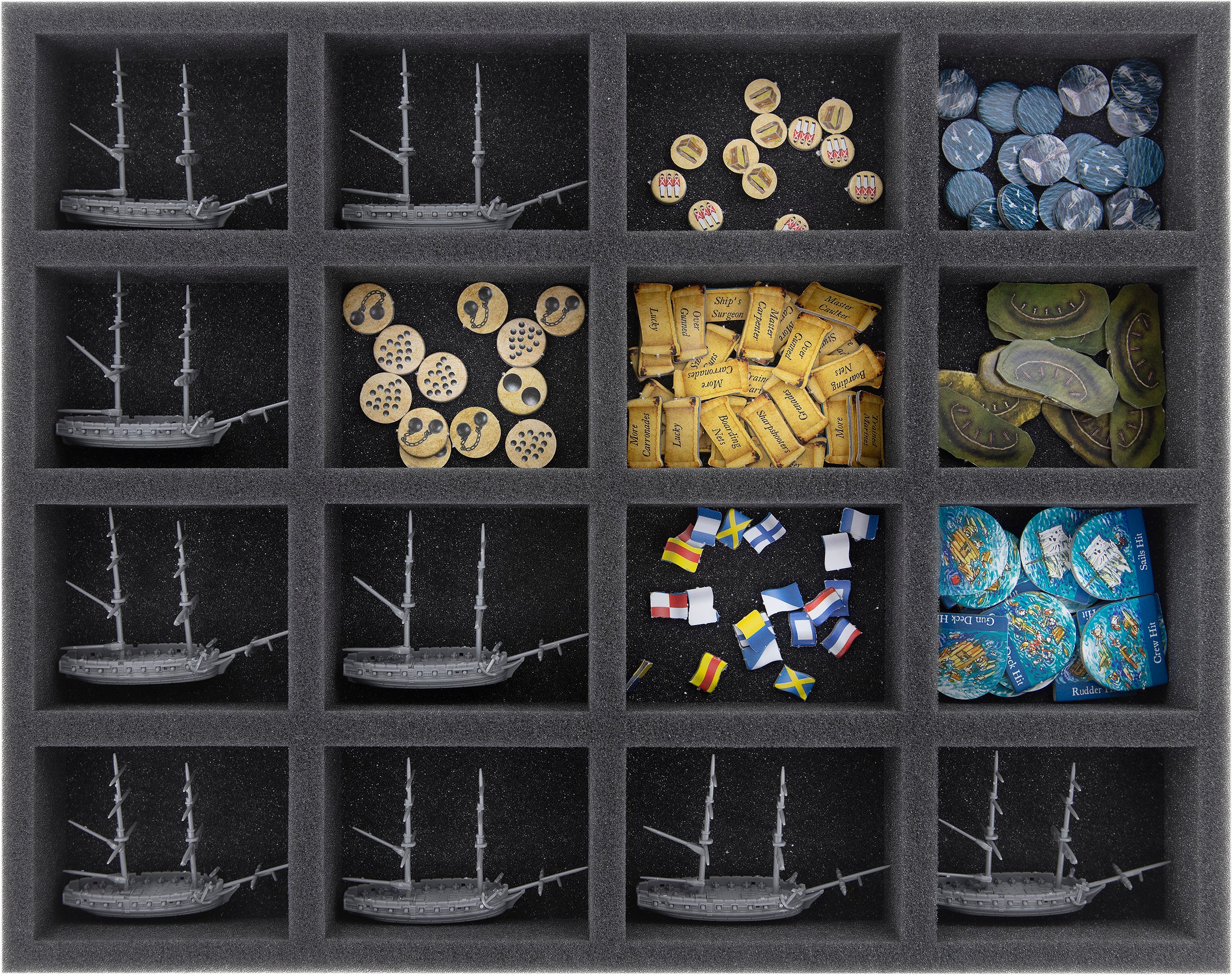 The two inserts with the 6 compartments are ideal to protect all large ships (Medium to Extra Large), such as frigates. Also the larger game components, such as tokens, tiles and cards can be stored here.