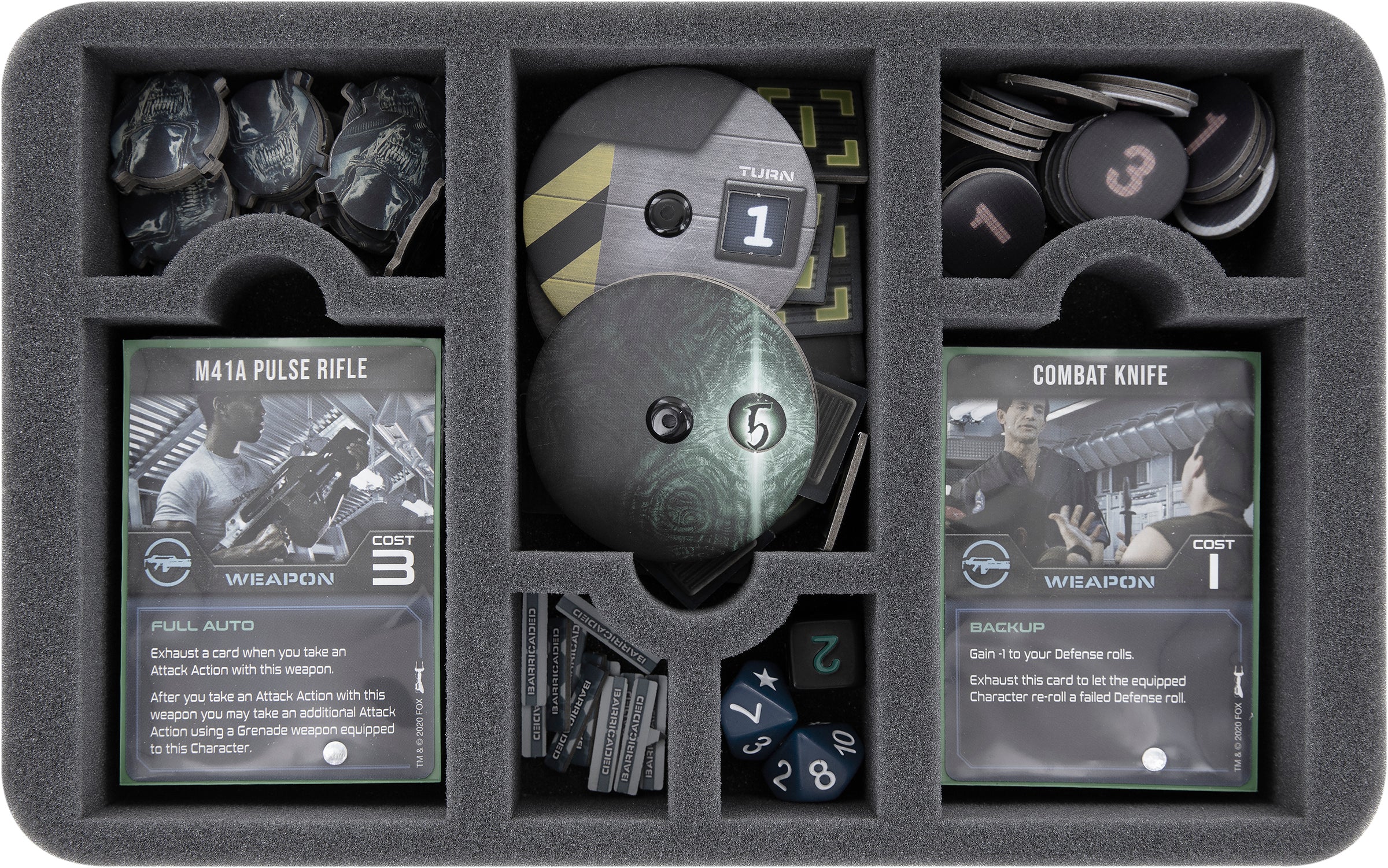 Four Half-Size foam trays are included to store the miniatures from the core game and the expansion. Every miniature like Ripley, the Marines, the Xenomorphs, and even the Xenomorph Queen receive a matching compartment.
