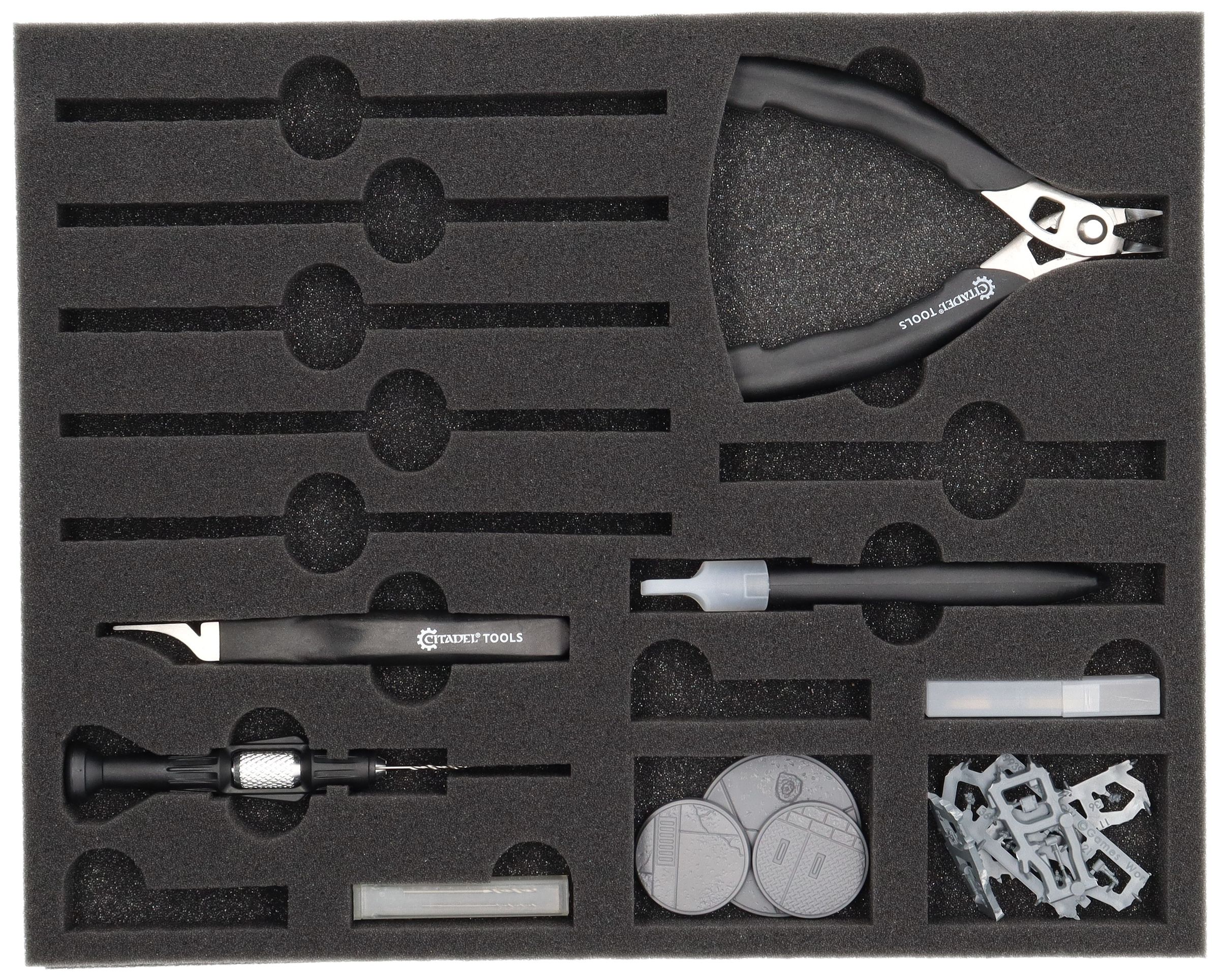 One Full-Size foam insert keeps your instruments in order. The 13 compartments are tailor-made for the following tools from GamesWorkshop: