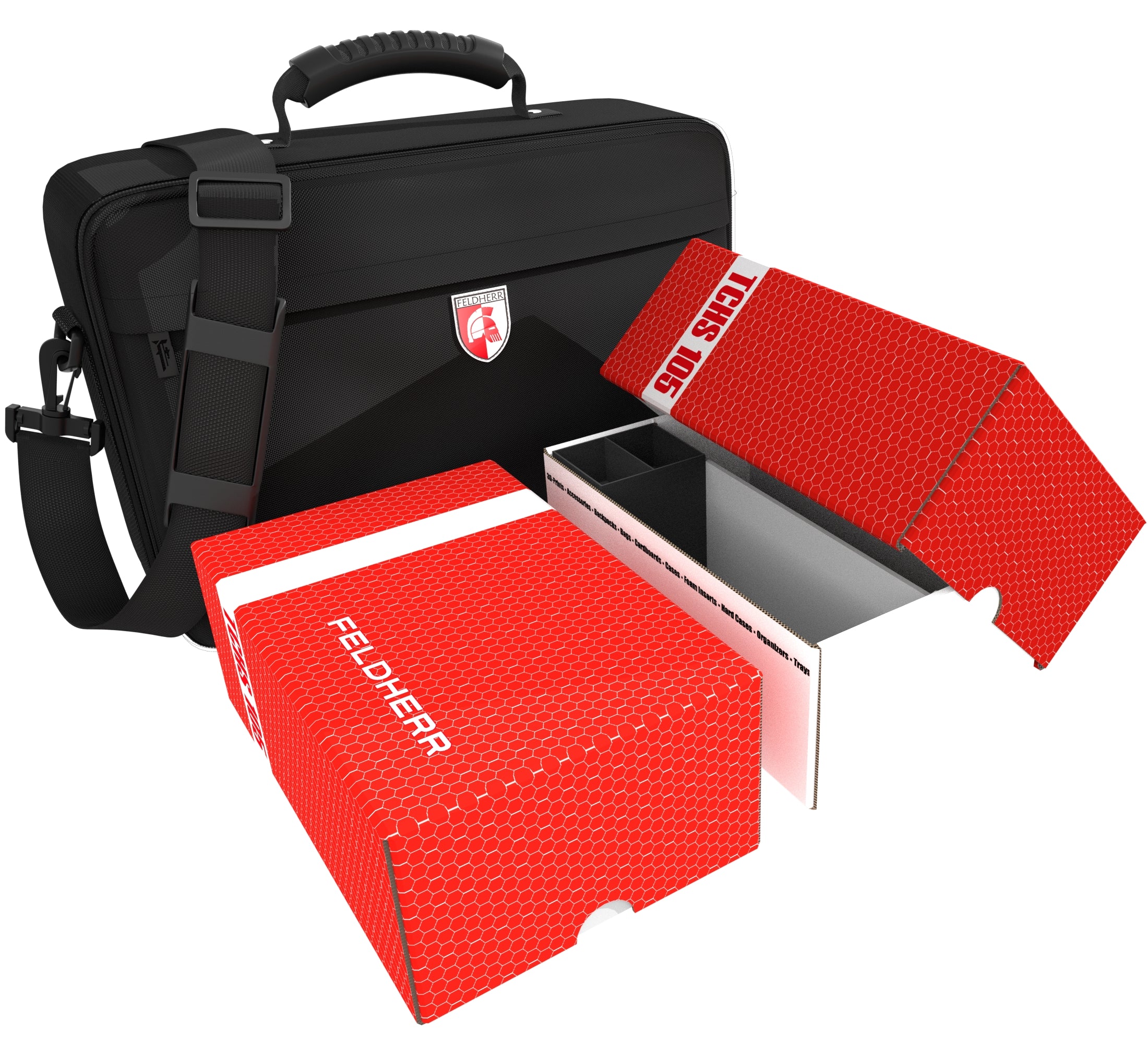 • The two stackable card boxes fit perfectly in the Feldherr MEDIUM bag and offer space for the more than 1500 cards from the Pledge.
