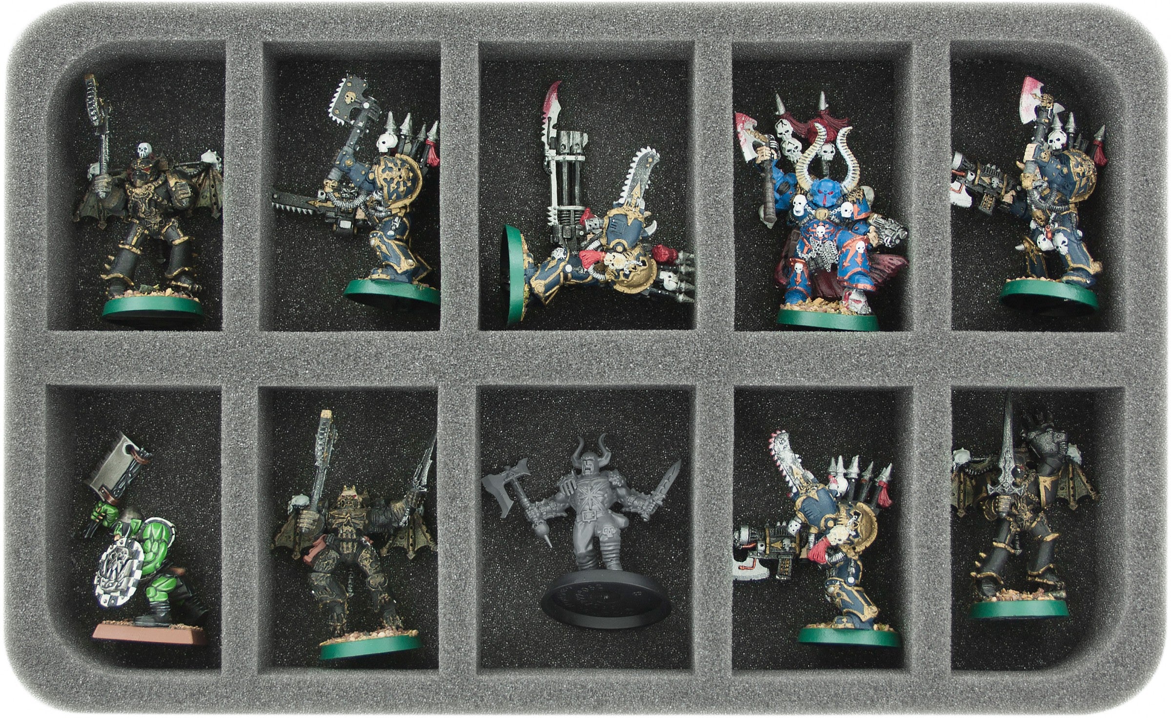 • 1 Half-Size foam tray with ten compartments for Chaos Space Marines, Chaos Cultists, or miniatures with similar dimensions (HSBE040BO)