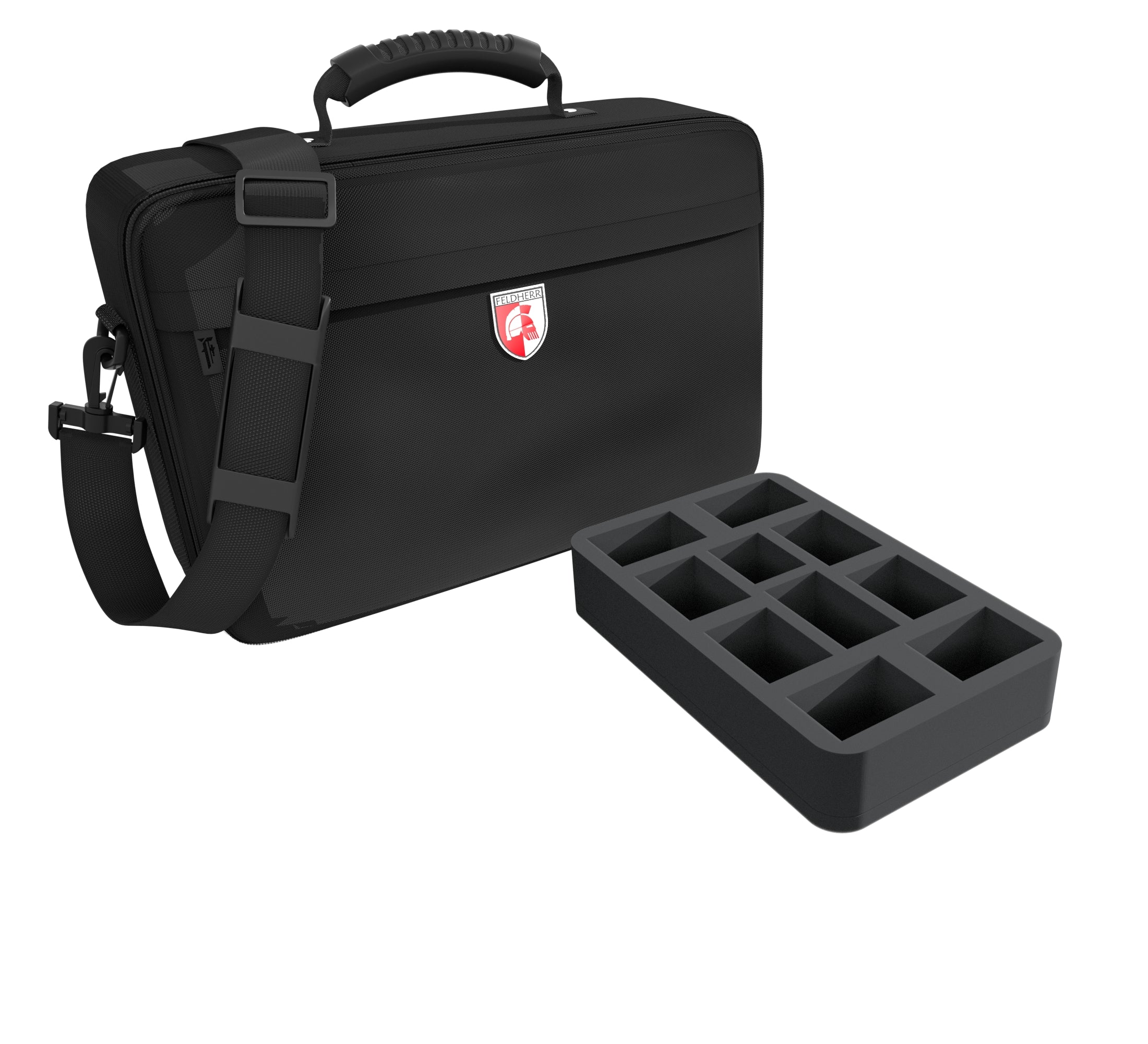 The foam tray with ten compartments offers you enough space for a squad of Vulkite Berzerkers or other miniatures with 32 mm bases. Of course, accessories, such as dice or tokens, can also be stored here neatly.
