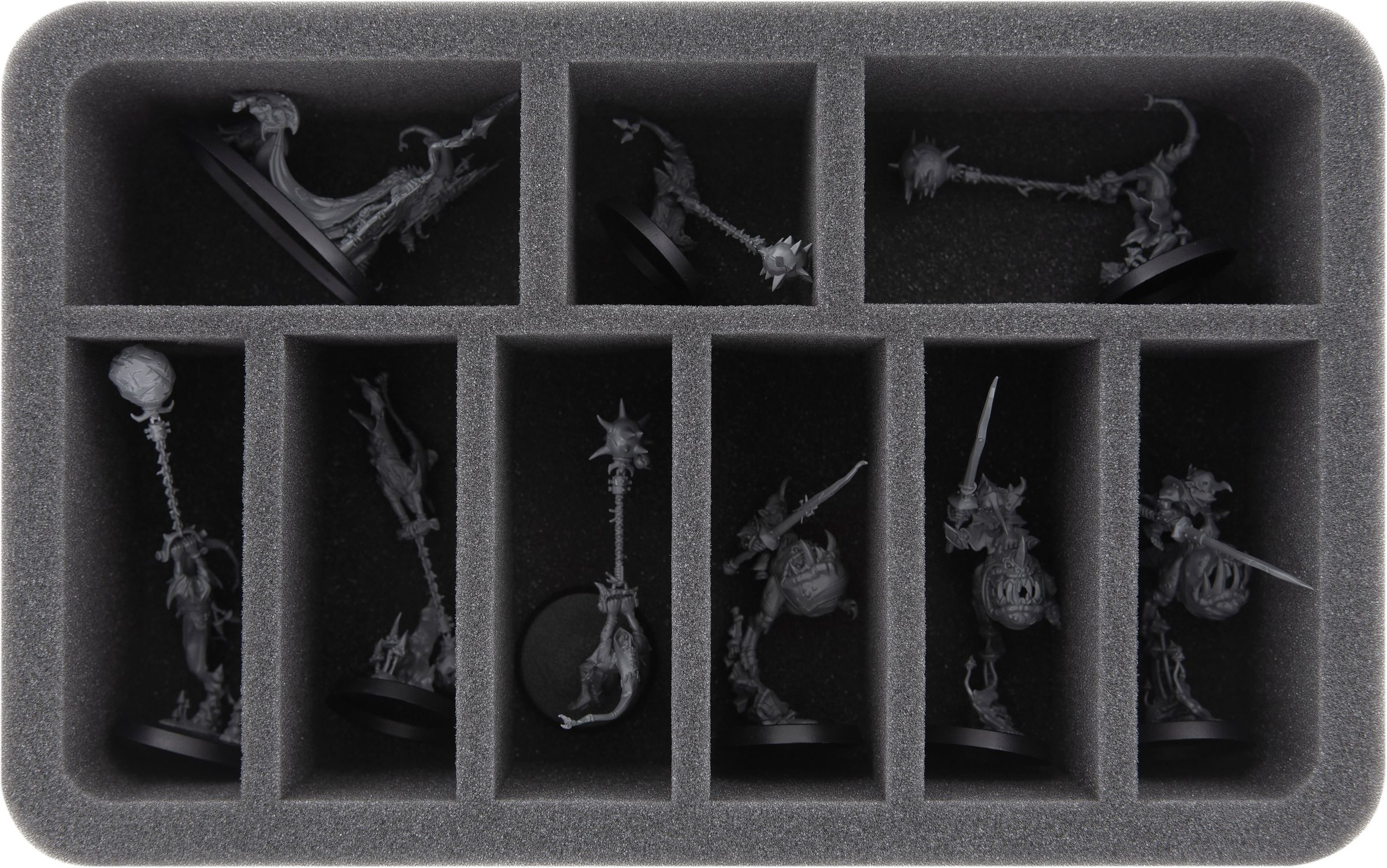 • 1 Half-Size foam trays with 9 compartments for lengthy Gloomspite Gitz models like the Loonboss, Squig Hoppers, Fanatics or Skagrott the Loonking (HS060WH56)
