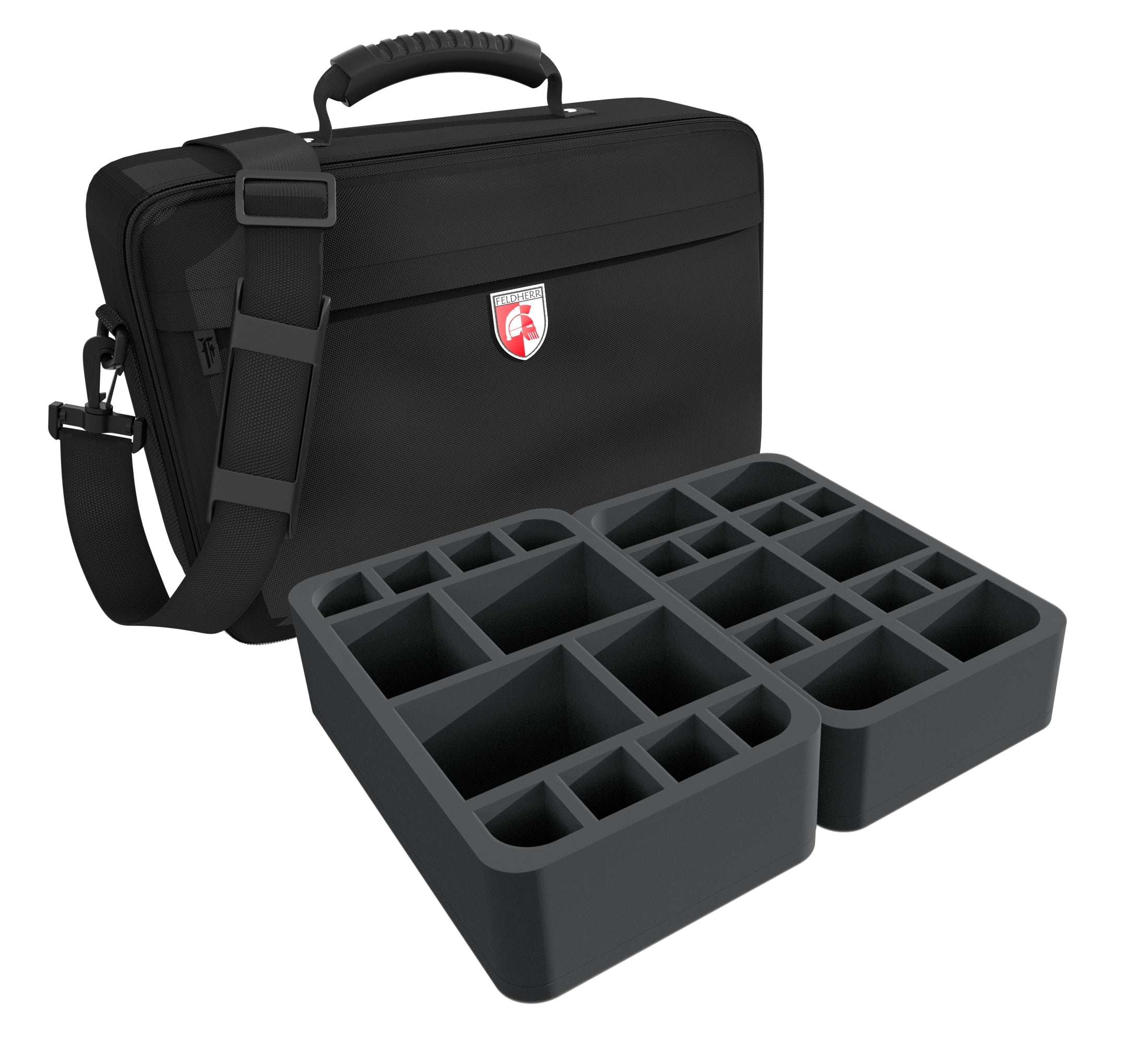 This MEDIUM bag, filled with matching Feldherr foam trays, holds up to 38 miniatures of your crews + cards and game accessories.