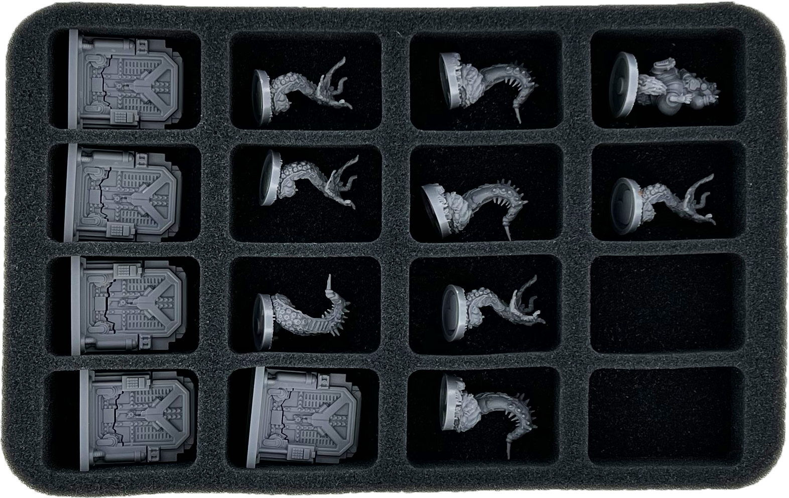 • 1 Half-Size foam tray with 16 compartments for miniatures like doors and small alien miniatures (HS035BF05BO)