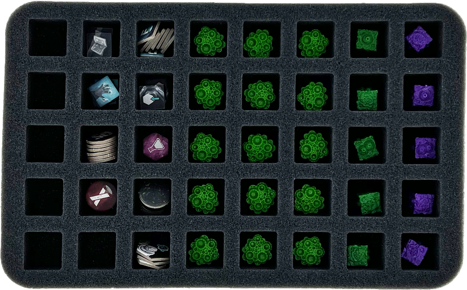 • 1 Half-Size foam tray with 40 quadratic compartments for small-sized game material like Chytric Spore Acrylic Tokens, cardboard tokens + small miniatures like Saprobes Models (HSHM030BO)