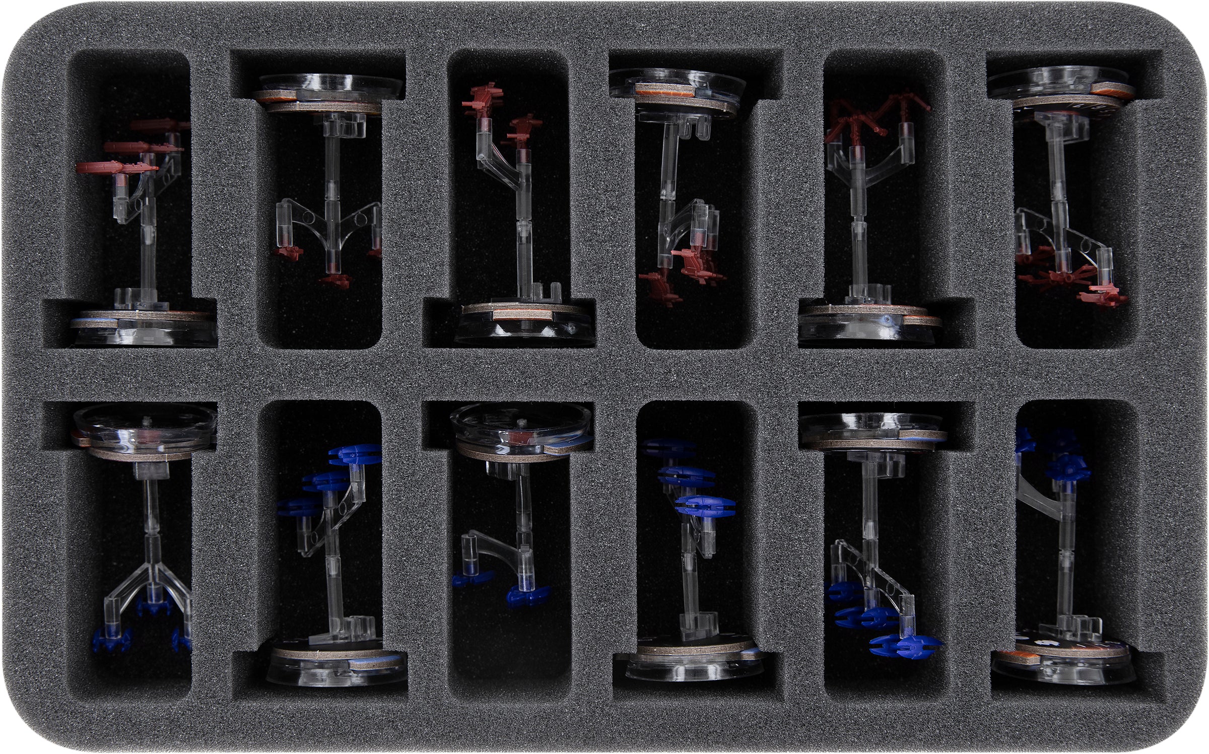 For stowing the V-19-Torrent squadrons from the Fleet Starter and the 8 miniatures from the Armada Expansion Pack "Republic Fighter Squadrons Expansion Pack" you will find the matching compartments on the second foam insert. Each of the 12 squadron miniatures including bases gets its own compartment here.
