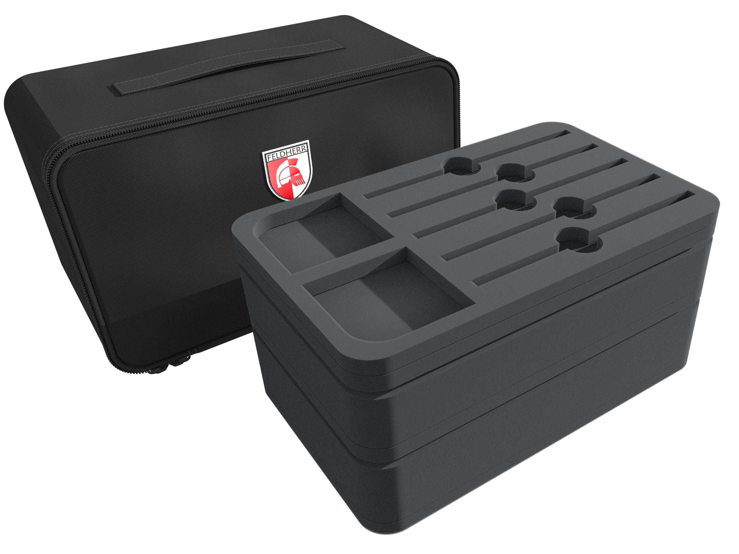 Have you planned a painting and modelling session with your friends but don't know how to transport your utensils to their place? No worries: In our MINI PLUS bag with matching foam trays, your tools, paint pots and small miniatures are splendidly stored and easily transported.