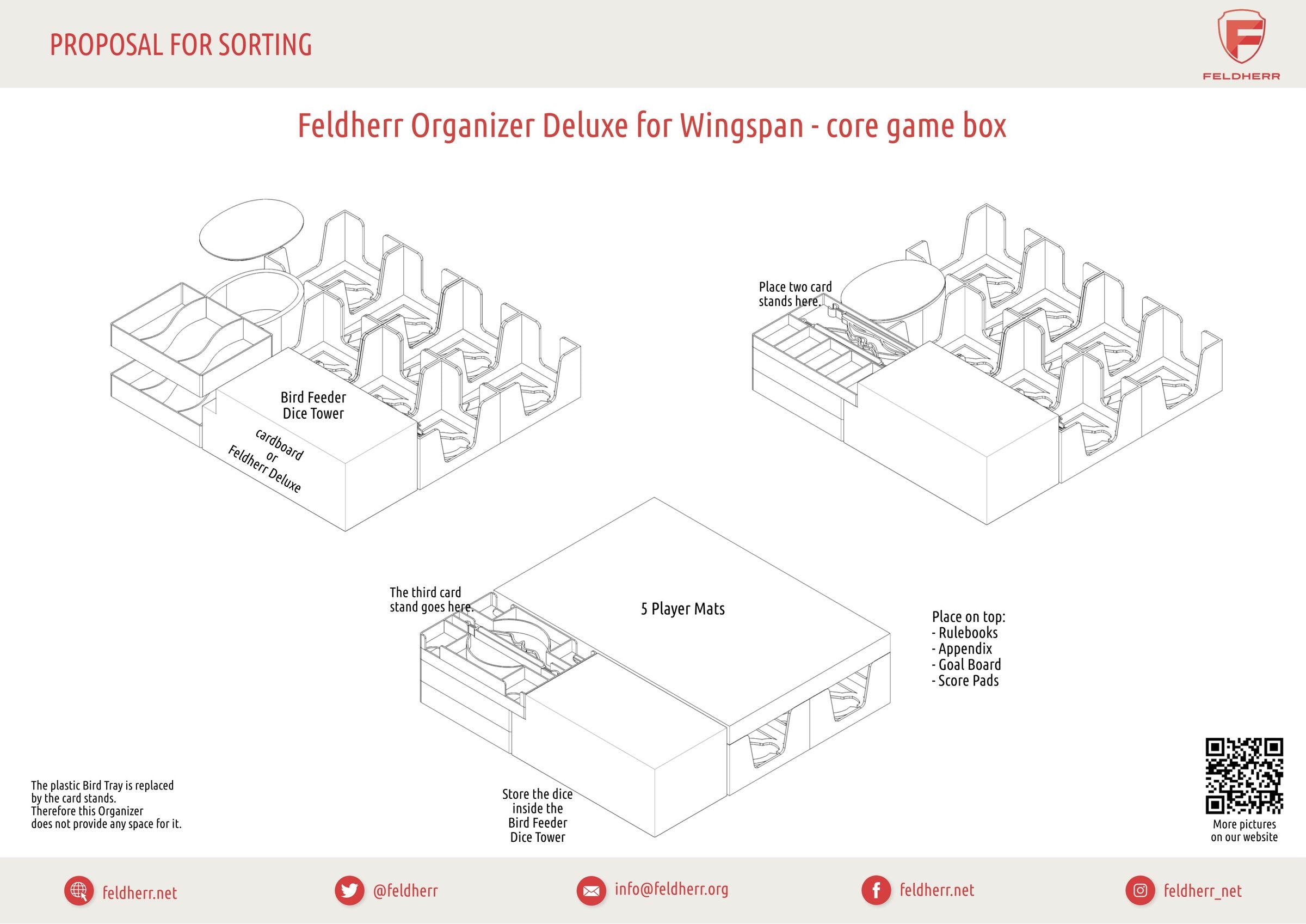 • The Organizer Deluxe is compatible with the separately available Feldherr Bird Feeder Deluxe for Wingspan. The house fits easily into the board game box together with the Organizer.