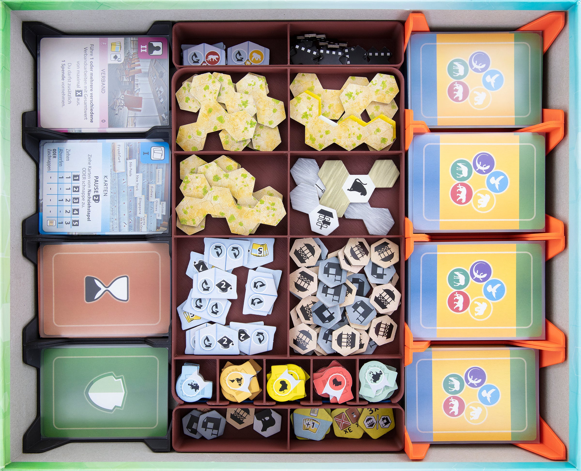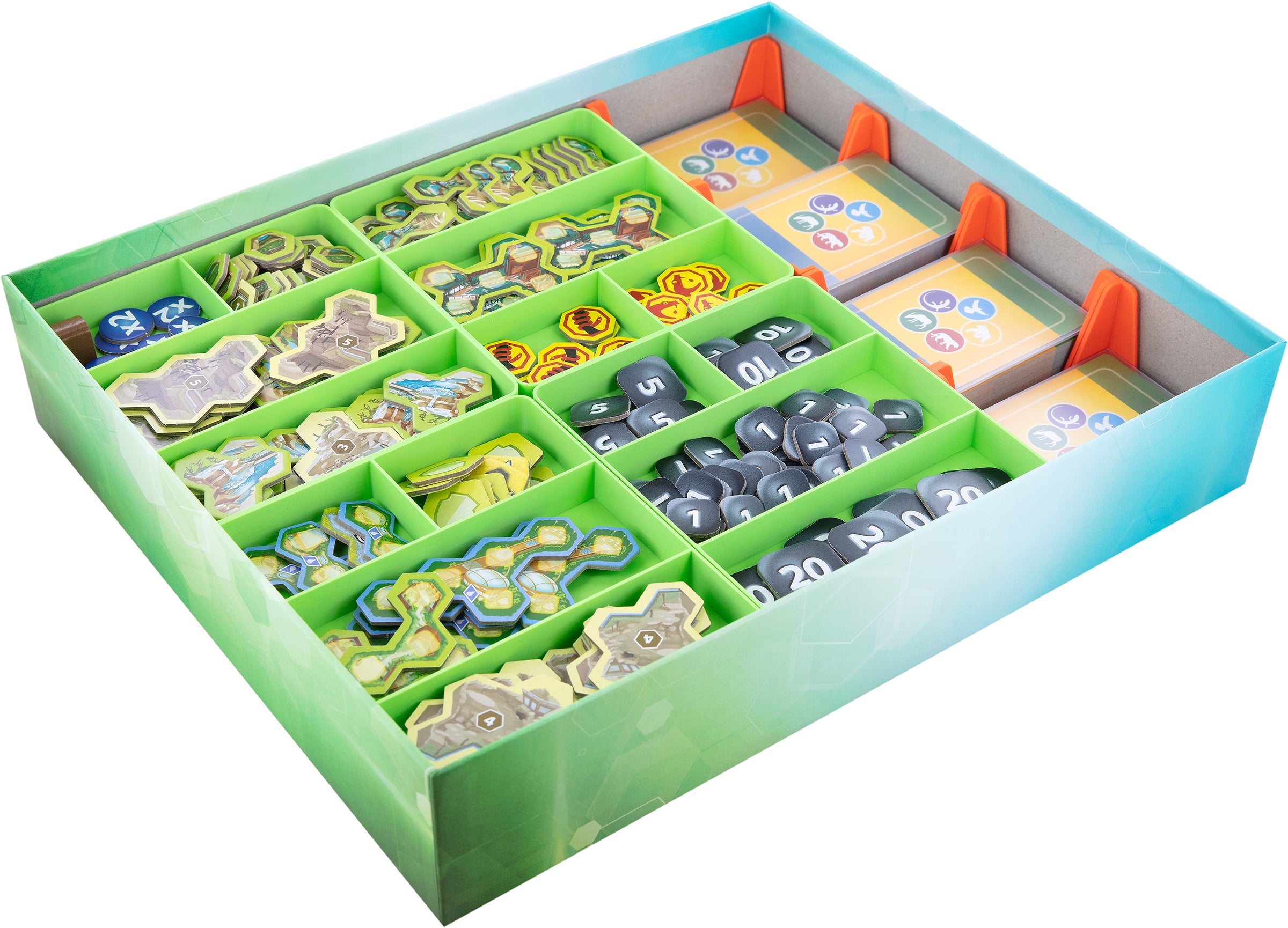 To help you give the animals a dignified life in your enclosures, we've taken control of your board game box. The token and card holders ensure that you have all the game material and the game under control. The clear structure of the Organizer means you won't miss a thing, and you'll quickly notice when pieces are missing or sorted incorrectly. For a quick start of the game take the trays out of the box and distribute them on the game table. Each player gets his own tray with the wooden markers in his color.