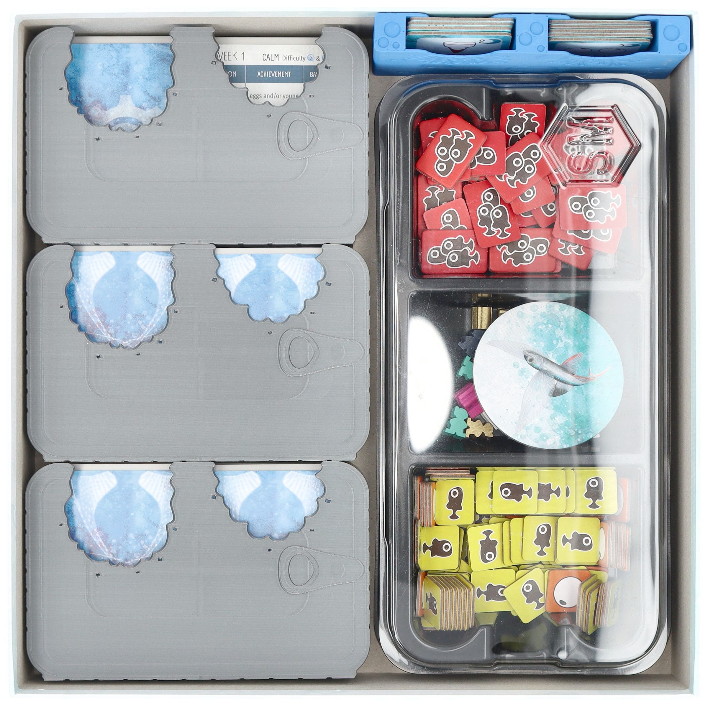 • For optimal storage in the box, the game's original plastic tray is required. It provides a designated place for Divers meeples, First-player Token, Week Tracker Token, Egg and Young Tokens, and School Tokens.