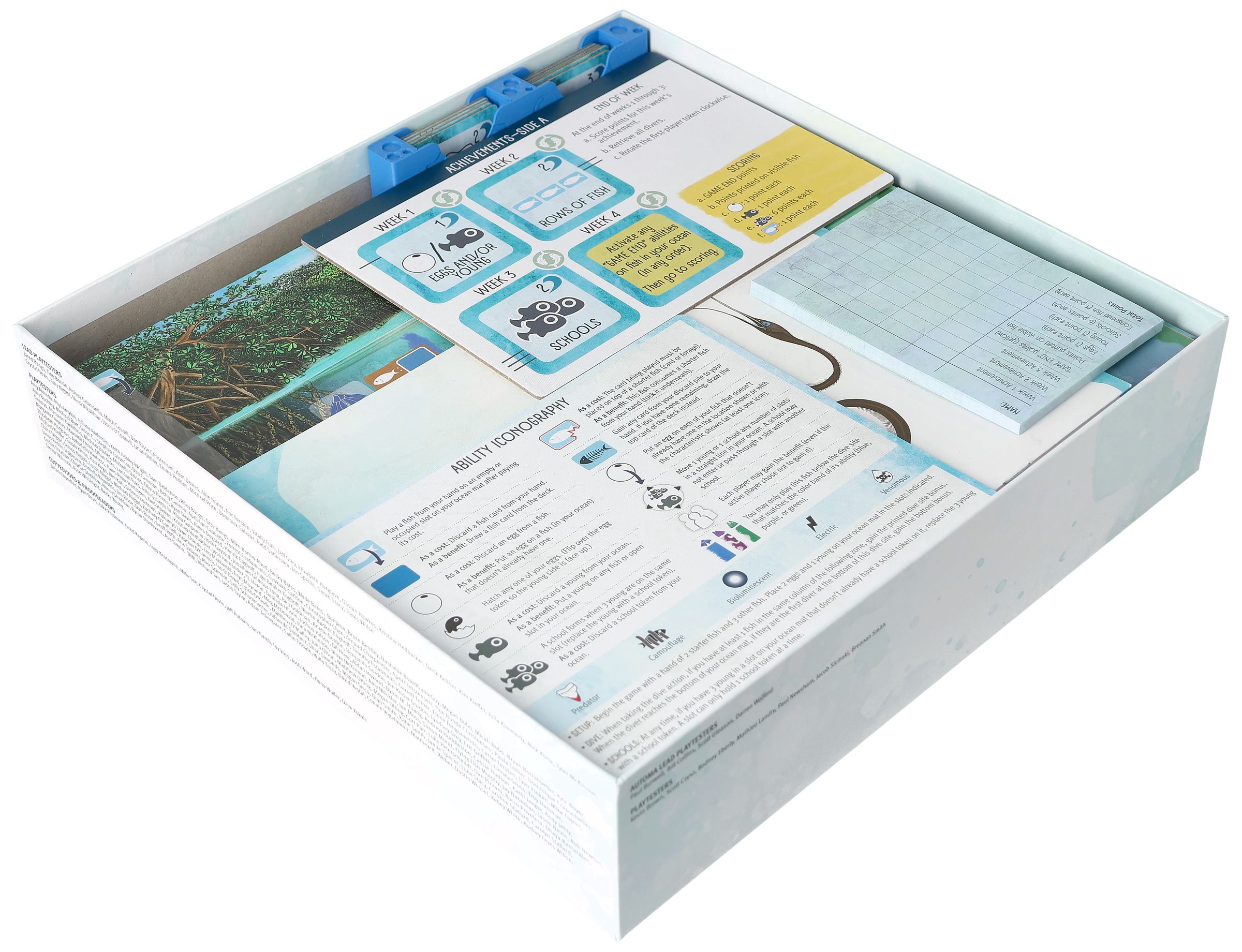 • Achievement Boards, Ocean Mats, Scorepad, Player Aids, and rulebook are safely stored on top of the organizer - nothing slips thanks to the 3D holder and access slot.
